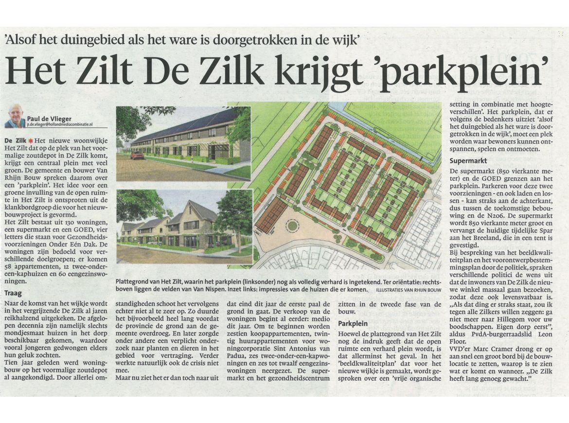 Op het voormalige Zoutdepot in De Zilk start Van Rhijn Bouw in mei 2019 met de bouw van 130 energieneutrale woningen, een supermarkt en een GOED (Gezondheidsvoorzieningen Onder Een Dak). Er komen 58 appartementen, 12 twee-onder-een-kapwoningen en 60 eengezinswoningen. De bouw zal worden gerealiseerd in twee fasen. In de eerste fase worden ook 20 huurappartementen voor woningbouwcorporatie Sint Antonius van Padua gerealiseerd. De woningen krijgen een epc van 0 en zijn vanzelfsprekend gasloos.