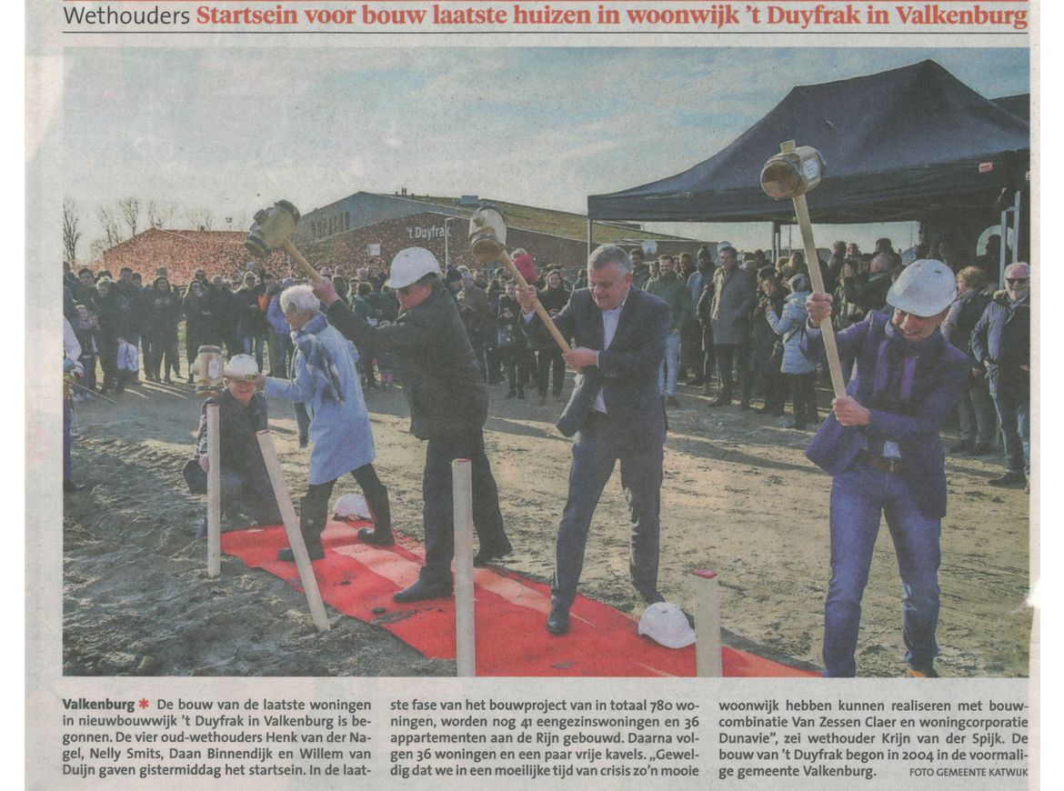 Onder grote belangstelling is vandaag donderdag 22 februari de eerste handeling verricht voor de bouw van 37 appartementen met een stallingsgarage aan de Oude Rijn in Valkenburg. De appartementen met prachtig uitzicht op de Rijn zijn allen verkocht en worden gebouwd door van Rhijn Bouw uit Katwijk, een van de ontwikkelaars van Zessen Claer.