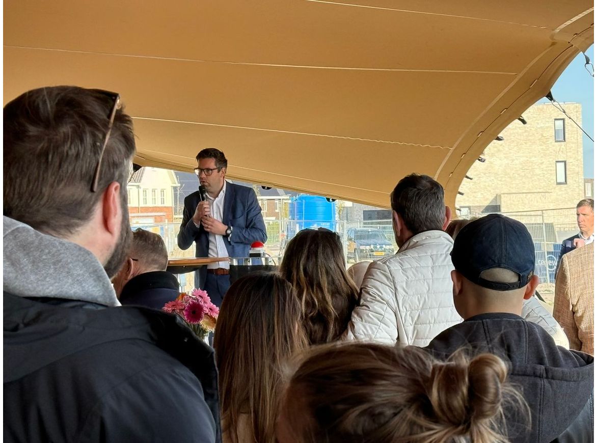 De start van de bouw van Parkwonen in Westergouwe is een feestelijk moment voor de kopers: eindelijk kunnen zij het tastbare begin zien van hun toekomstige thuis. Voor de aannemers is dit het startschot van alle verschillende werkzaamheden die hier in onderlinge afstemming samen moeten komen - komend jaar is dit hun werkplek. Voor alle betrokkenen in de planfase is dit het moment dat de verbeelding plaatsmaakt voor de daadwerkelijke realisatie van de integraal doordachte plannen. Verschillende gedachten, maar allemaal blije gezichten. Van die gezichten waren er extra veel aanwezig, omdat tegelijk ook de eerste paal werd geslagen van de deelplannen de Kolk en Eilandwonen. Daarbij kon wethouder Jan Kees Oppelaar de toekomstige bewoners vertellen dat nu ook snel veel voorzieningen in de wijk zullen volgen, zoals lagere scholen. De feestelijkheid in Westergouwe in Gouda werd onderstreept door stralend weer, planken Goudse kaas, vuurwerk en stroopwafels!