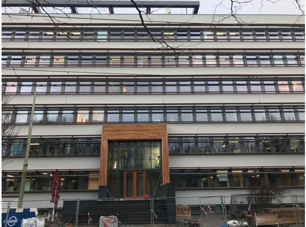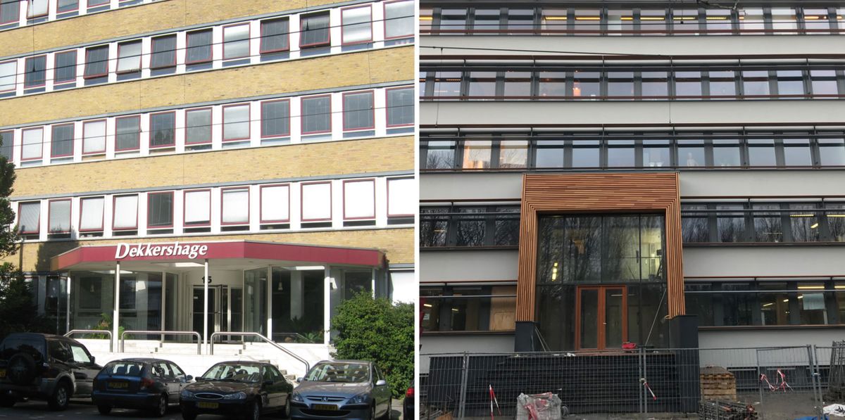 Het gedateerde kantoorpand aan de Werf in Den Haag krijgt een frisse nieuwe uitstraling! De oplopende temperaturen in de zomer worden direct tegengegaan door het toevoegen van bouwkundige zonwering. Deze zonwering versterkt de horizontale belijningen van de oorspronkelijke architectuur van het gebouw. De bestaande gemetselde gebouwschil wordt ingepakt en de kozijnen worden vervangen, het gebouw is daardoor thermisch beter geïsoleerd. Ten slotte heeft de bestaande één-laagse entree plaats gemaakt voor een prominente dubbel hoge entree met een sierlijke houten omlijsting en een trap van zwart graniet.