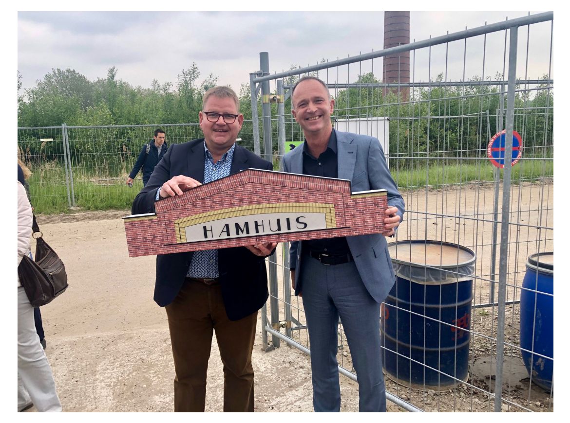 Vrijdag heeft het Hamhuis in Bergen op Zoom het hoogste punt bereikt! Het timpaan - voorzien van de naam van het gebouw - werd hiervoor onthuld door de wethouder Patrick van der Velden. Job van Someren, directeur bij ERA Contour, verraste de burgemeester vervolgens met een miniatuurversie van het timpaan!