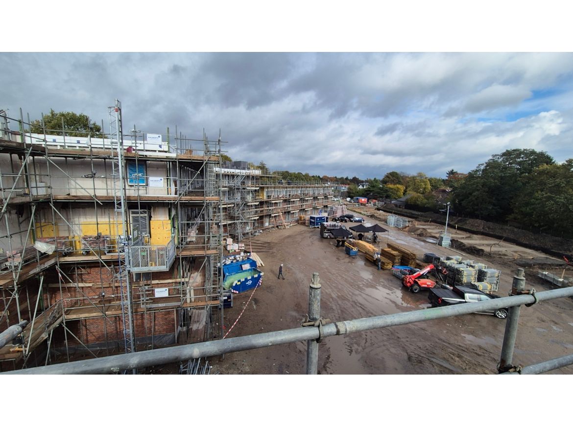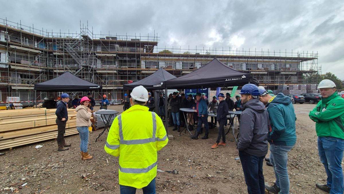 Op dinsdag 21 oktober vierden we het hoogste punt van Leyens Erve in Bilthoven! Ondanks een paar druppels regen genoten de aanwezigen, toekomstige bewoners, Woningcorporatie Woongroen, diverse adviseurs en andere betrokkenen van een gezellig moment op de bouw, compleet met een hapje, drankje en een mooi uitzicht op het werk in uitvoering.