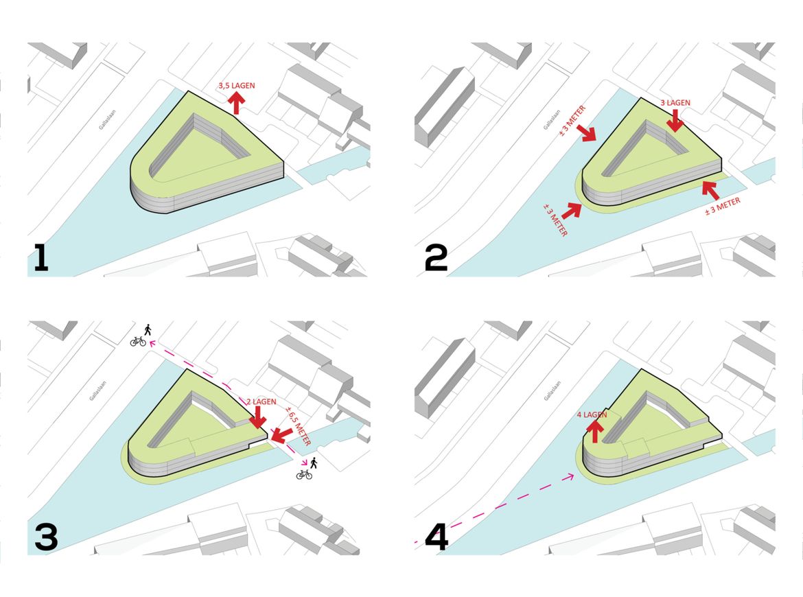Inspiratie voor de architectuur komt voort uit de bijzondere vorm van het kavel. Het kavel dient zich als het ware aan als een scheepsboeg die het water in tweeën splitst. Deze vorm van het kavel, en de verschillende hoogtes van de omringende bebouwing, hebben geleid tot een weloverwogen massa van het gebouw, met een bescheiden hoogte accent op het splitsingspunt aan het water. Vanuit daar meandert de massa naar beneden om aansluiting te zoeken met de bouwhoogtes aan de zijde van het Heelblaadjespad. Een dynamisch gebouw met een alzijdige oriëntatie als resultaat.