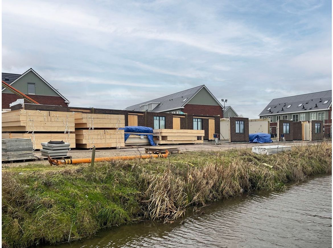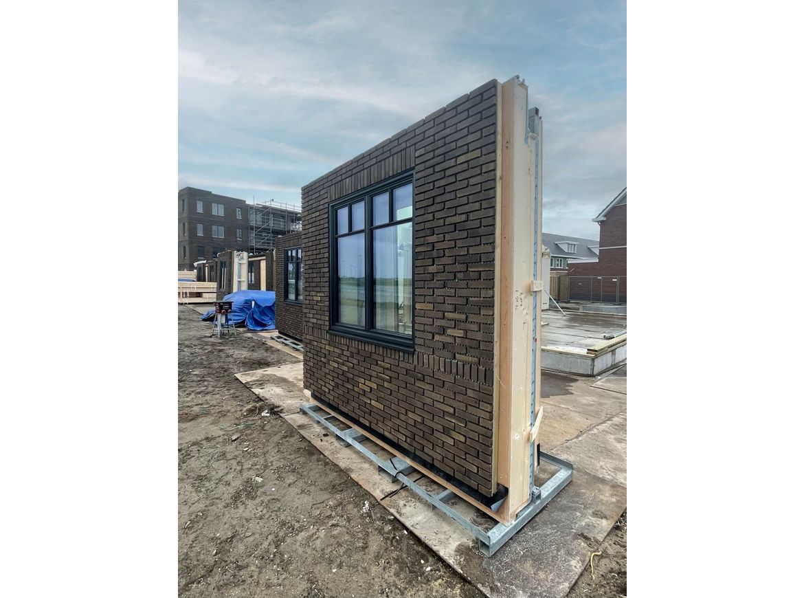 Het slotstuk op de uitbreidingswijk Hooghkamer in Voorhout wordt momenteel geplaatst. Zeven grondgebonden woningen zijn ontworpen op basis van het prefab houten bouwsysteem van IIBO. De woningen zijn voorzien van massieve houten wanden met natuurlijke isolatie en afgewerkt met steenstrips op de buitengevel. Door verantwoord gebruik van materialen is het project volledig biobased, duurzaam en circulair. De ontwerpuitdaging was groot om de gewenste architectonische kwaliteit van een bollenpakhuis te laten rijmen met het houten bouwsysteem. Door de samenwerking tussen aannemer Van der Hulst, prefab houtbouwer IIBO en architectenbureau Van Manen is het plan zowel architectonisch als prefab-technisch goed op elkaar afgestemd. Als het weer (vooral de wind) meewerkt, worden de woningen in 2 weken gemonteerd!
