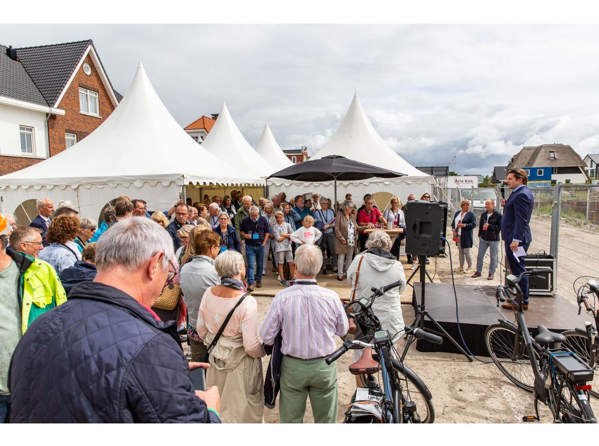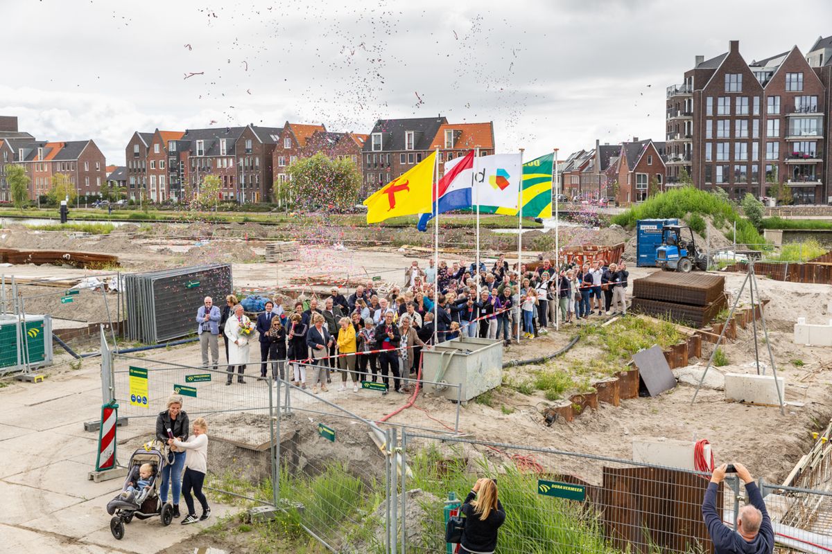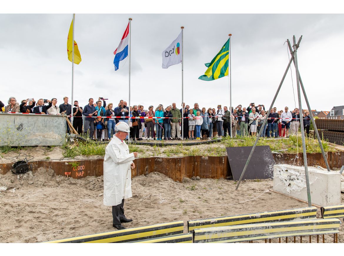 Afgelopen maandag 8 juli is het startsein gegeven voor de bouw van “Kop van Rhijn” bestaande uit 44 appartementen en 20 grachtenwoningen. Bas Kalter heette iedereen namens BPD Ontwikkeling van harte welkom en hij lichte kort het proces en het plan toe. Eén van de nieuwe bewoners had speciaal voor het plan een gedicht geschreven en droeg dit voor. Wethouder Glasbeek sprak daarna alle aanwezigen toe en liet op gepaste wijze een fles champagne kapot vallen tegen een funderingselement. Op deze manier kreeg het nieuwbouwplan een “scheepsdoop” onder toeziend oog van alle toekomstige bewoners en mensen die aan het project hebben bijgedragen. Alle aanwezigen konden daarna onder genot van een hapje een drankje nader kennis met elkaar maken. Het plan zal begin 2021 door Dura Vermeer opgeleverd worden.