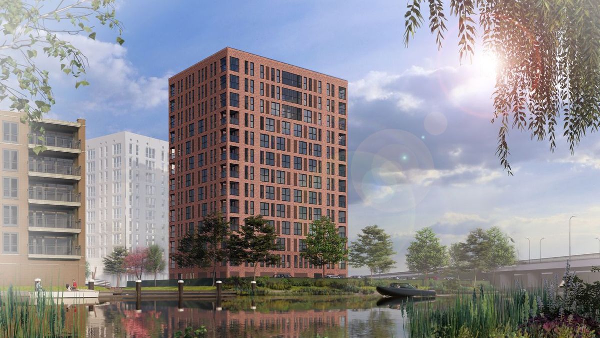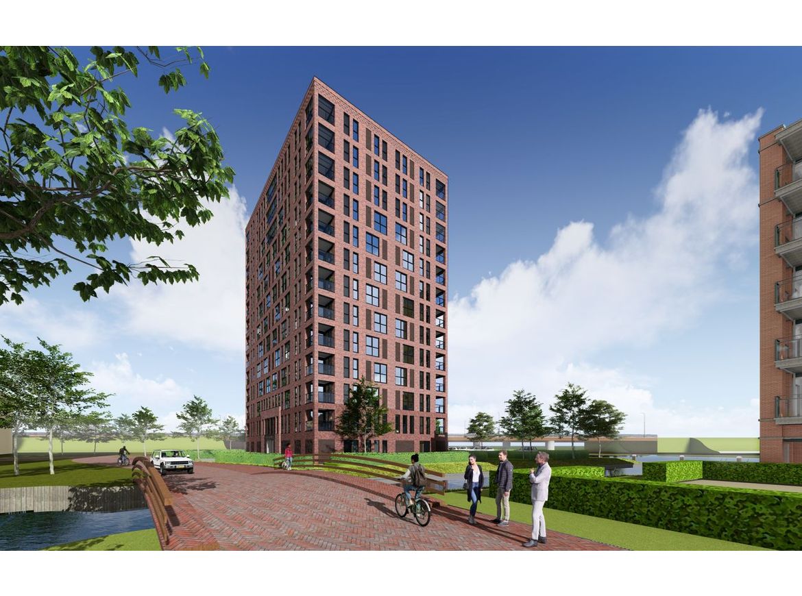 Afgelopen week is de eerste ceremoniële paal geslagen van de woontoren ‘Sublimes’. Dit gebouw zal de plek markeren waar de Oude Rijn en de N206 elkaar kruisen. De woontoren huisvest 90 woningen. De onderste laag bevat de entree, fietsenstallingen en het bergingenhuis, daarboven komen 9 lagen met daarin 72 sociale appartementen in totaal. De bovenste drie lagen bevatten 18 woningen in het middenhuur segment.
