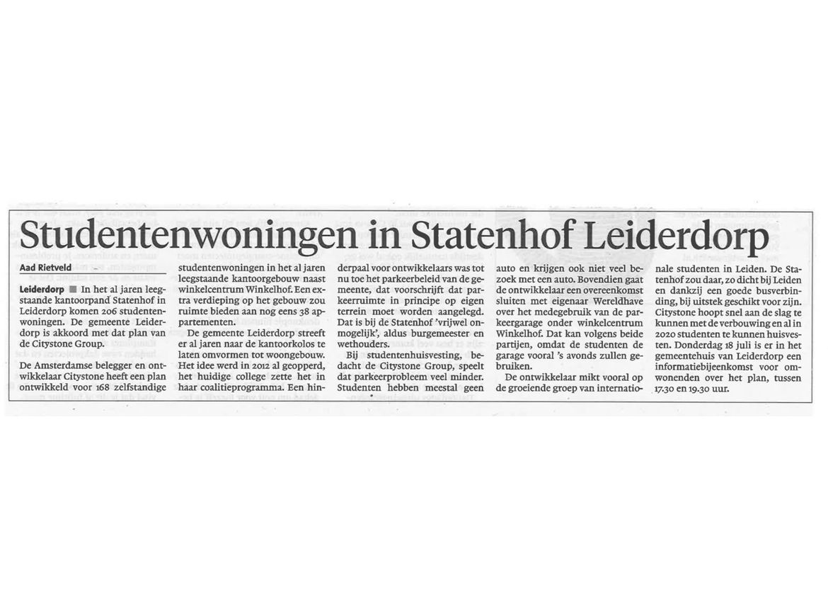 De Statenhof in Leiderdorp - 10.000m2 leegstaand kantoor - wordt in de herontwikkeling van Citystone Group getransformeerd tot 206 studentenwoningen met retail in de plint. In het ontwerp dat wij hiervoor maakten is op het bestaande gebouw een verdieping toegevoegd. De verwachting is dat in 2020 de eerste studenten hier hun intrek kunnen nemen. Zie ook het artikel in het Leids Dagblad.