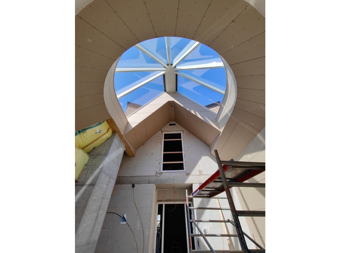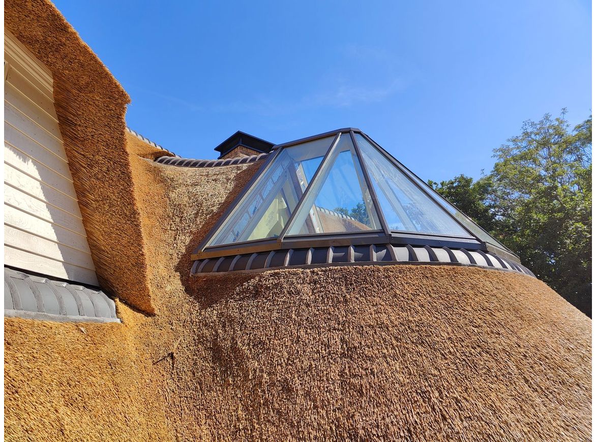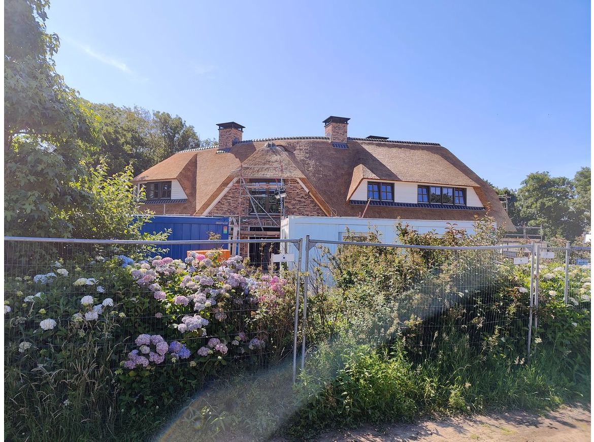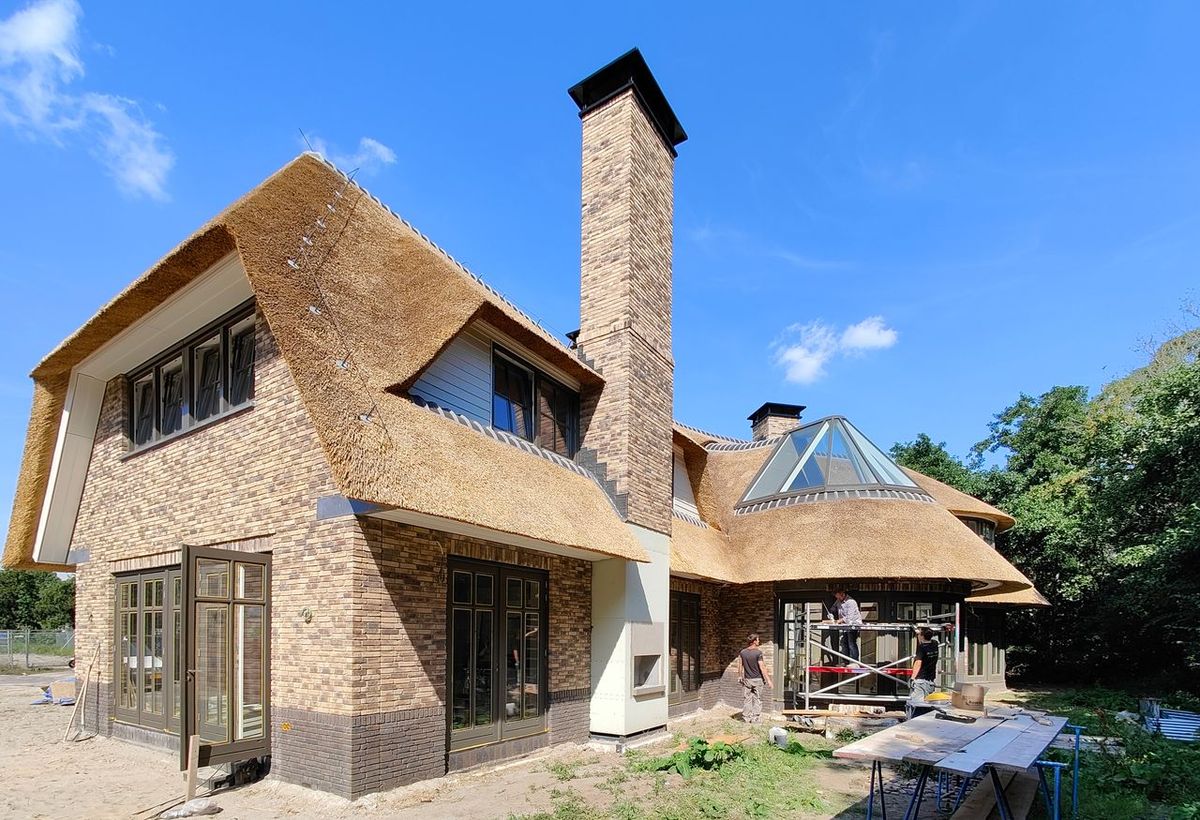 De villa is ontworpen met een aantal rondingen, waardoor een enorm speels en plastisch geheel is ontstaan. De gebogen vormen worden versterkt door het rieten dak. Een extra accent in het rieten dak wordt gemaakt met een hoek dakraam. Een sterk staaltje engineering!