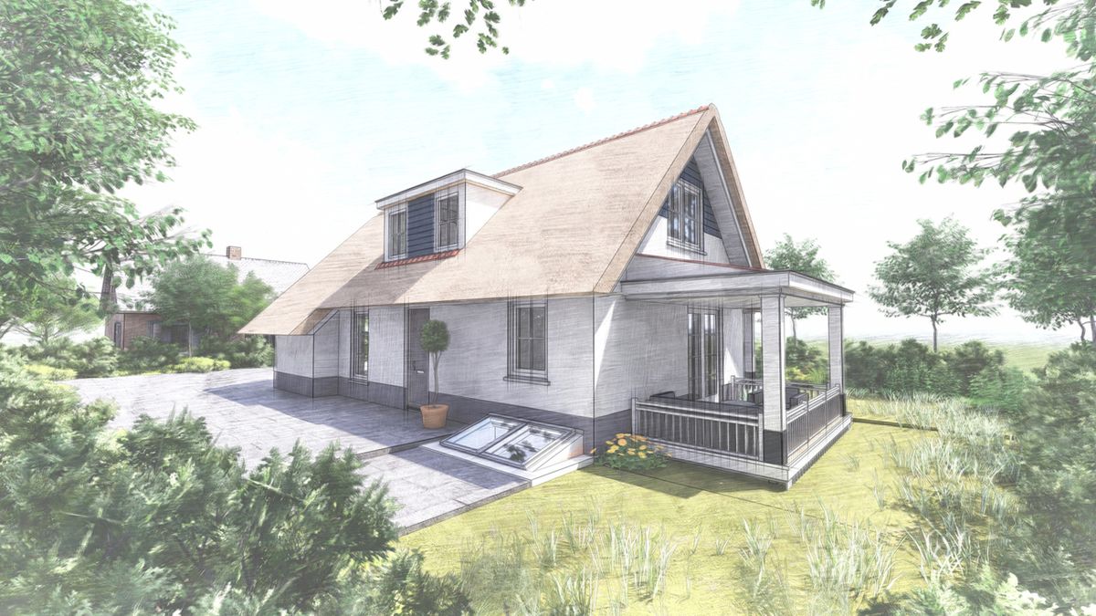 De deels onderkelderde woning bevat een compleet woonprogramma op de begane grond. Op de verdieping bevinden zich nog twee slaapkamers en een badkamer. Om het vakantiegevoel te benadrukken, krijgt de woning zelfs twee veranda's. De gevels worden wit gestuct en het dak wordt voorzien van riet.