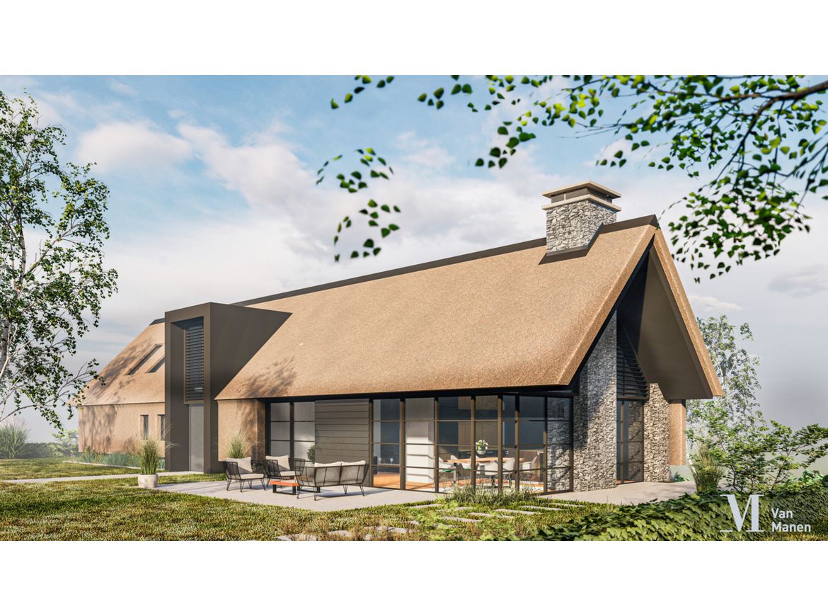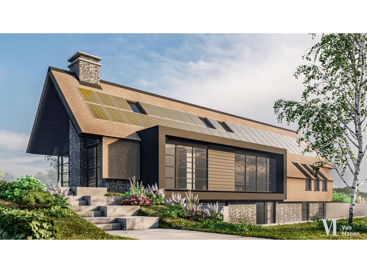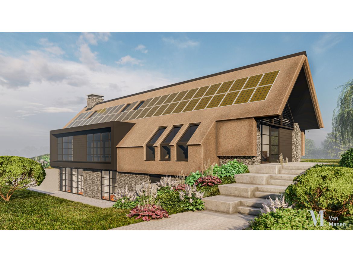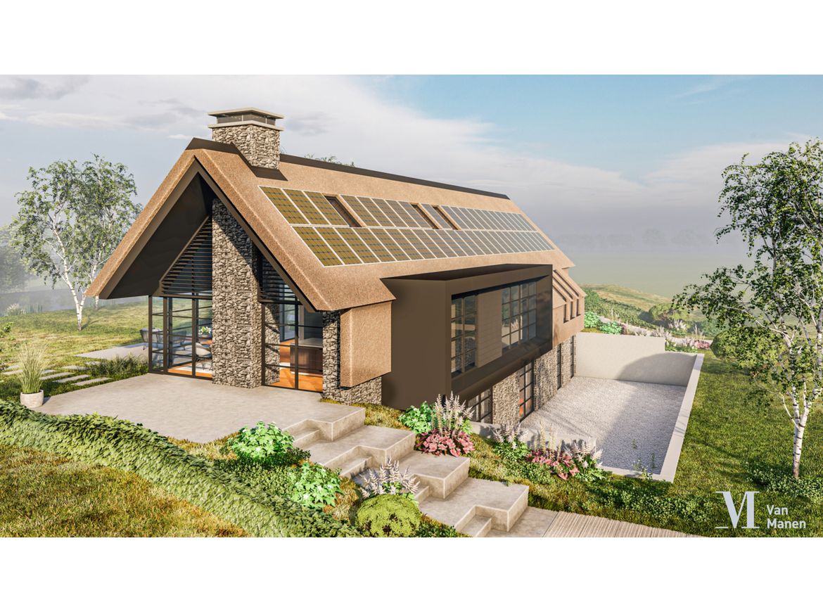 De gevels worden uitgevoerd in natuursteen, de puien en de entree van gemoffeld aluminium en het geheel wordt afgedekt met een prachtige rieten kap.