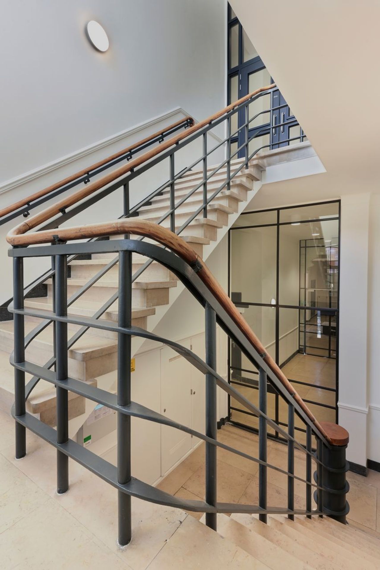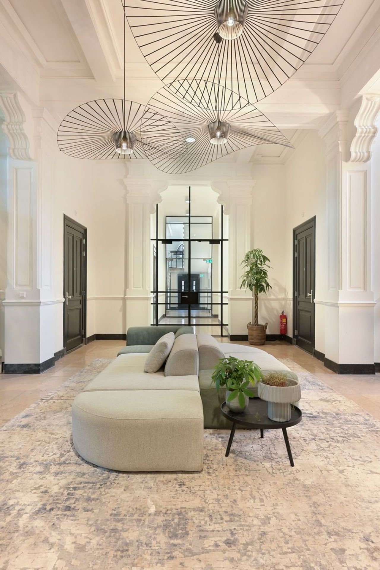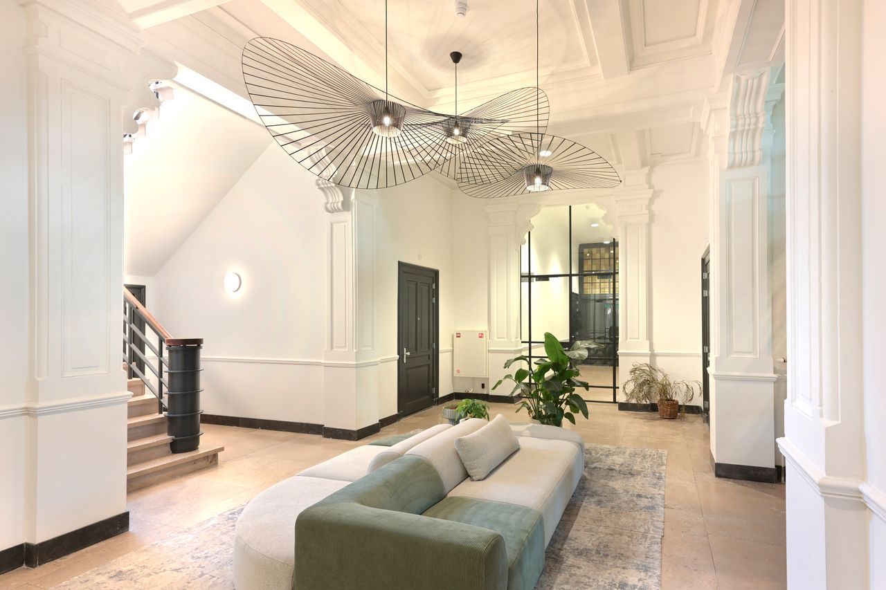 De geornamenteerde algemene ruimtes met natuurstenen trappen, architraven, lambriseringen en geprofileerde plafonds zijn daar waar nodig hersteld. In de appartementen zijn maatwerk trappen ontworpen die naadloos overgaan in de balustrade van de entresol verdieping. Deze dragen in combinatie met het open balklaag plafond van de entresol dragen in grote mate bij aan de ruimtelijke beleving van de voormalige leslokalen.