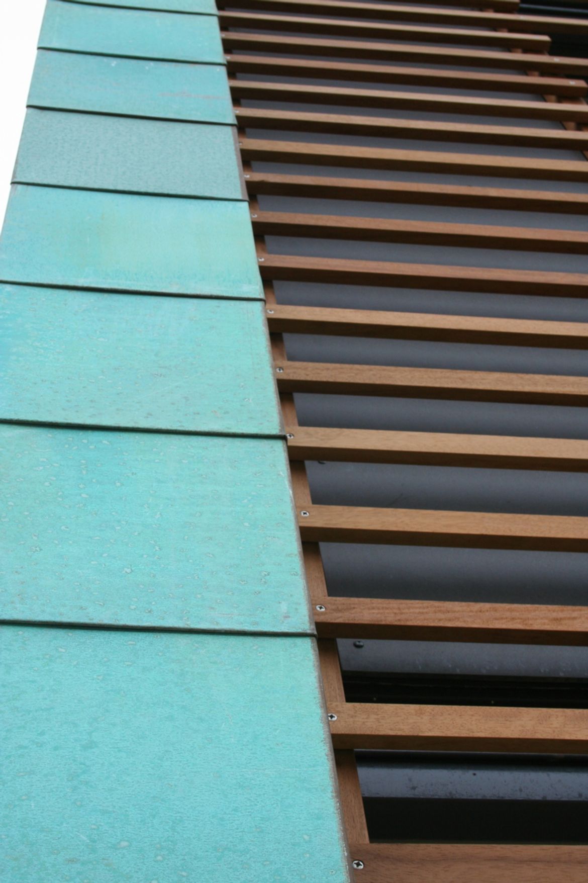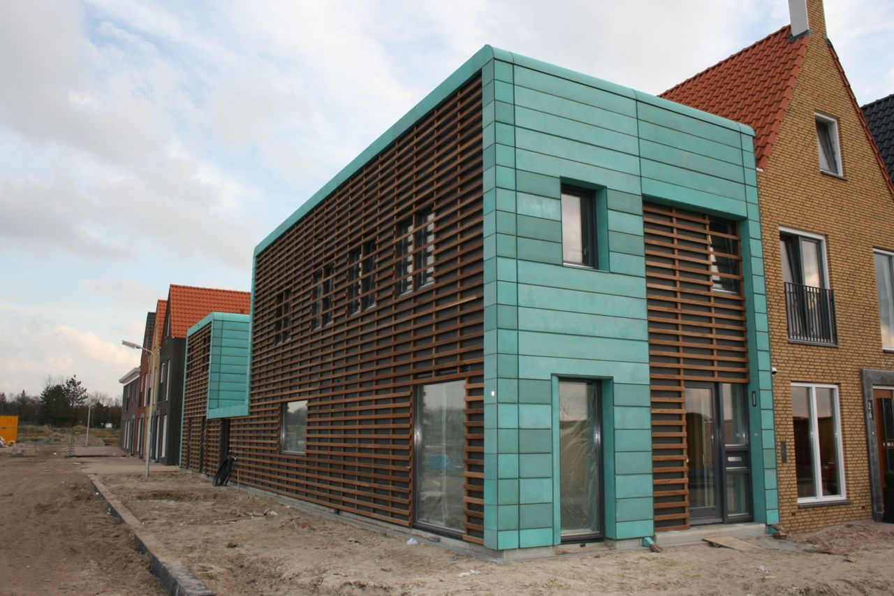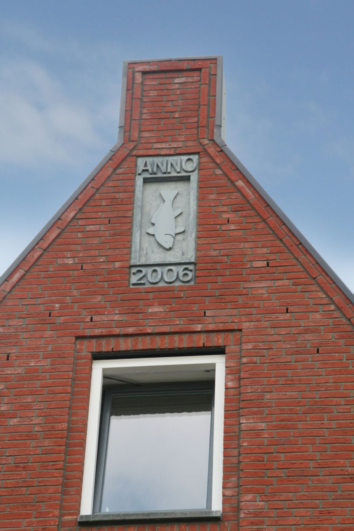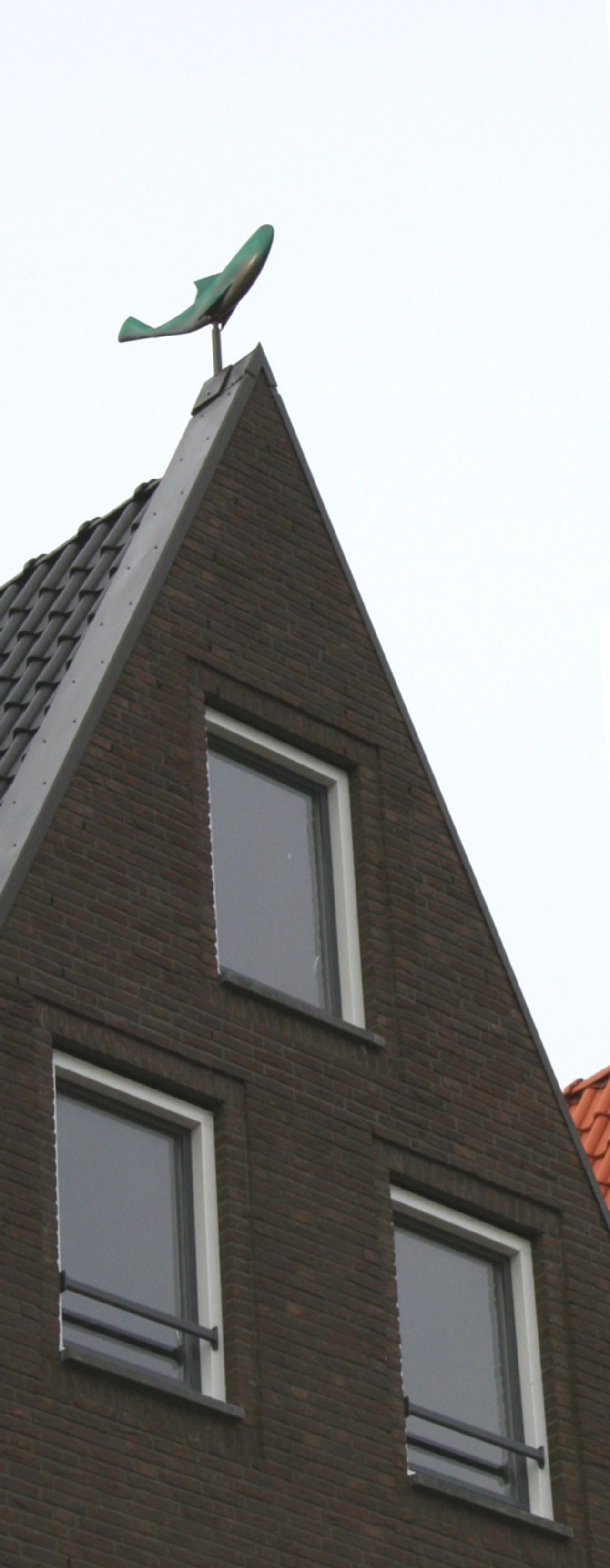 Voor de haven hebben we een wand met hoge grachtenpanden ontworpen in verschillende stijlen. Soms met een tuitgevel, soms als een dubbelbrede woning maar altijd met een trapje voor de deur. Een bijzonder terugkerend kenmerk van deze woningen is een vis, deze komt in verschillende gedaanten terug. Er zit ook een grapje tussen. Vroeger brandde er af en toe wel eens een pand af en dan kwam er iets volstrekt nieuws tussen te staan. Hier is dat het koperen huis - een contrasterend ontwerp maar wel met traditioneel materiaal. Voor de ronde hoek van het bouwblok ontwierpen wij een klein appartementengebouw.