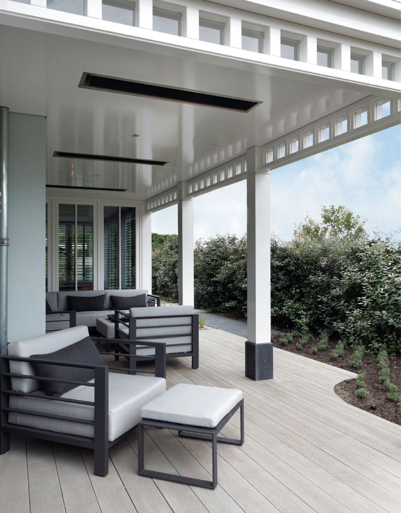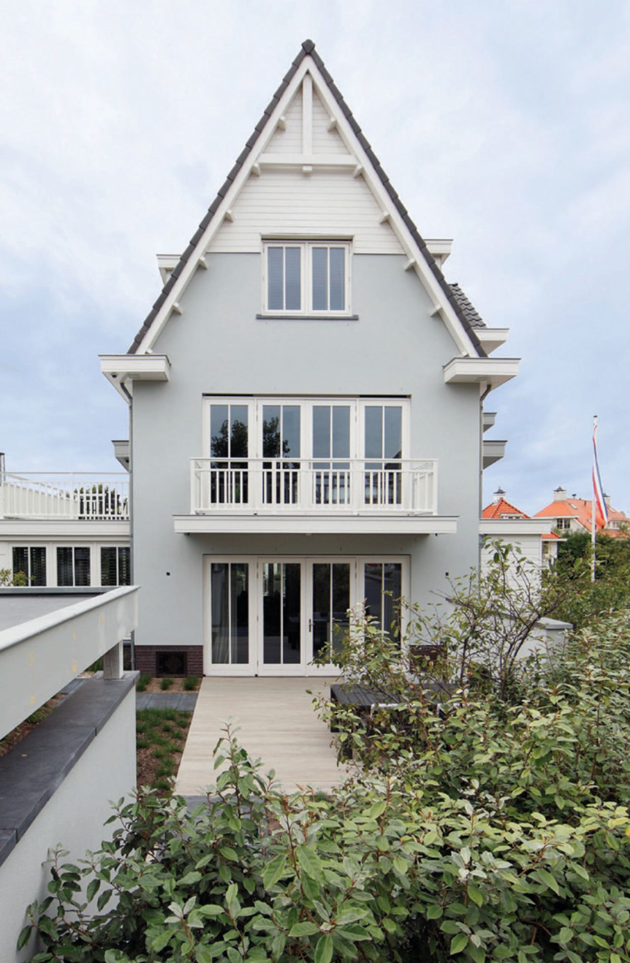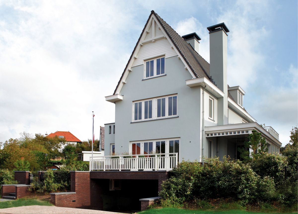Deze woning in de Noordwijkse Zuidduinen is opgetrokken in de charmante, klassieke Noordwijkse stijl. Deze kenmerkt zich hier door het zachtgrijs geschilderd stucwerk, klassiek witte kozijnen, details als de doorstekende gordingen, het sierspant in de topgevel, het timmerwerk bij de veranda en de doorstekende schoorstenen.