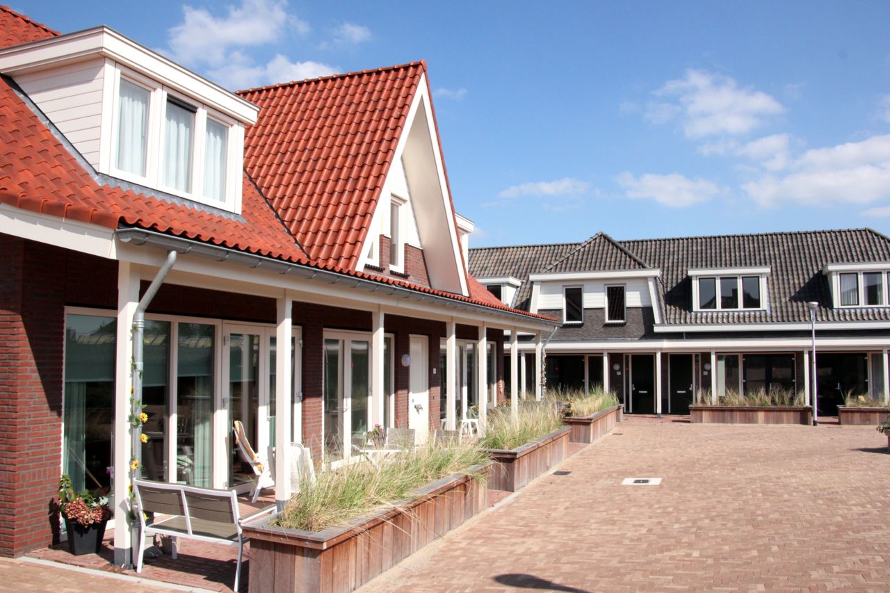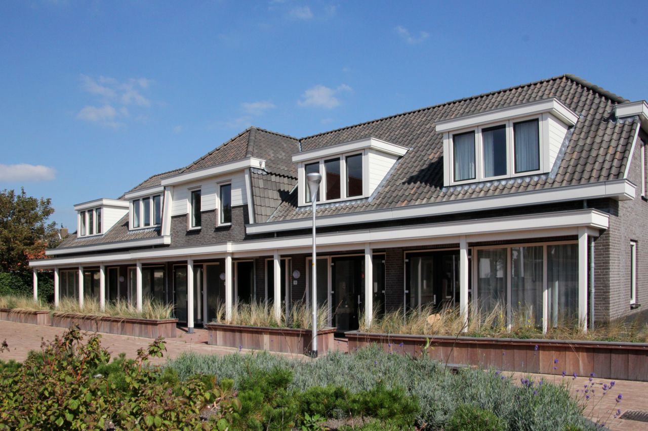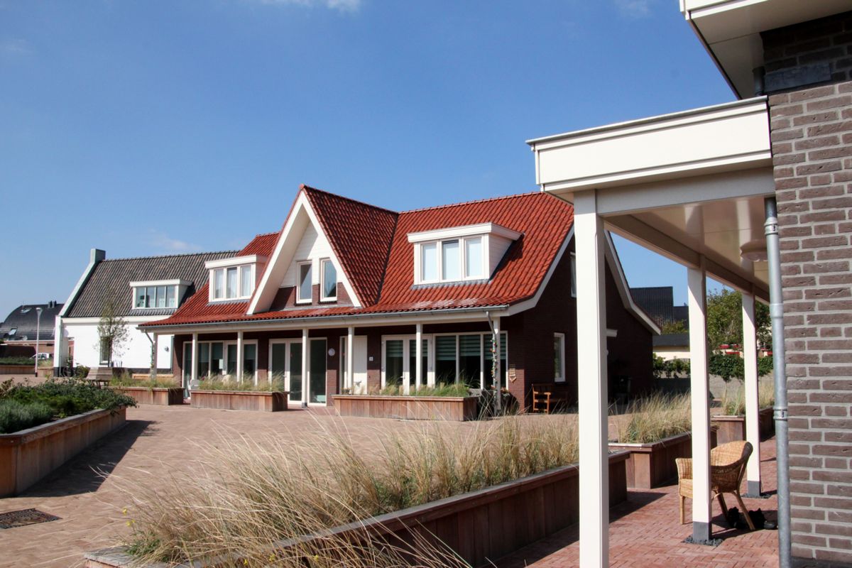 Het oude terrein van de Witte Mavo aan de Duinweg is ingesloten door typische dorpswoningen. Hier is de wens van de Noordwijkse Woningstichting (NWS) van 11 sociale huurwoningen gerealiseerd in een beschut hofje met een autoluw karakter.