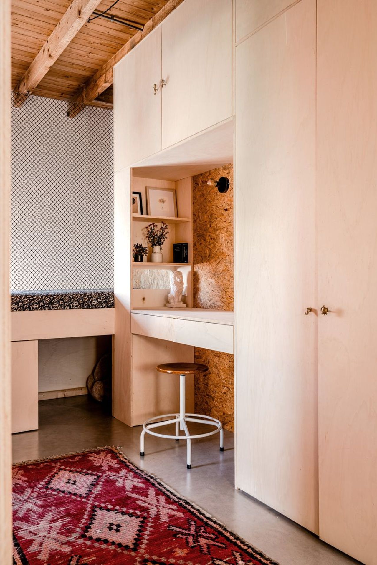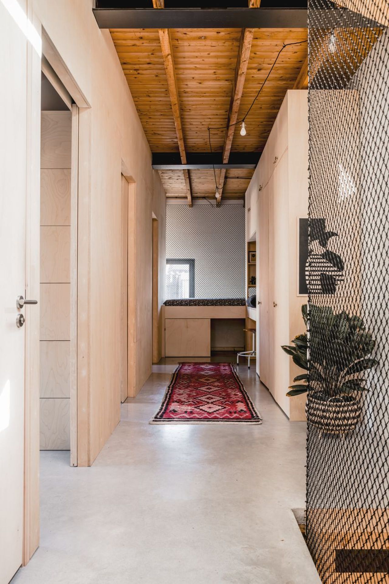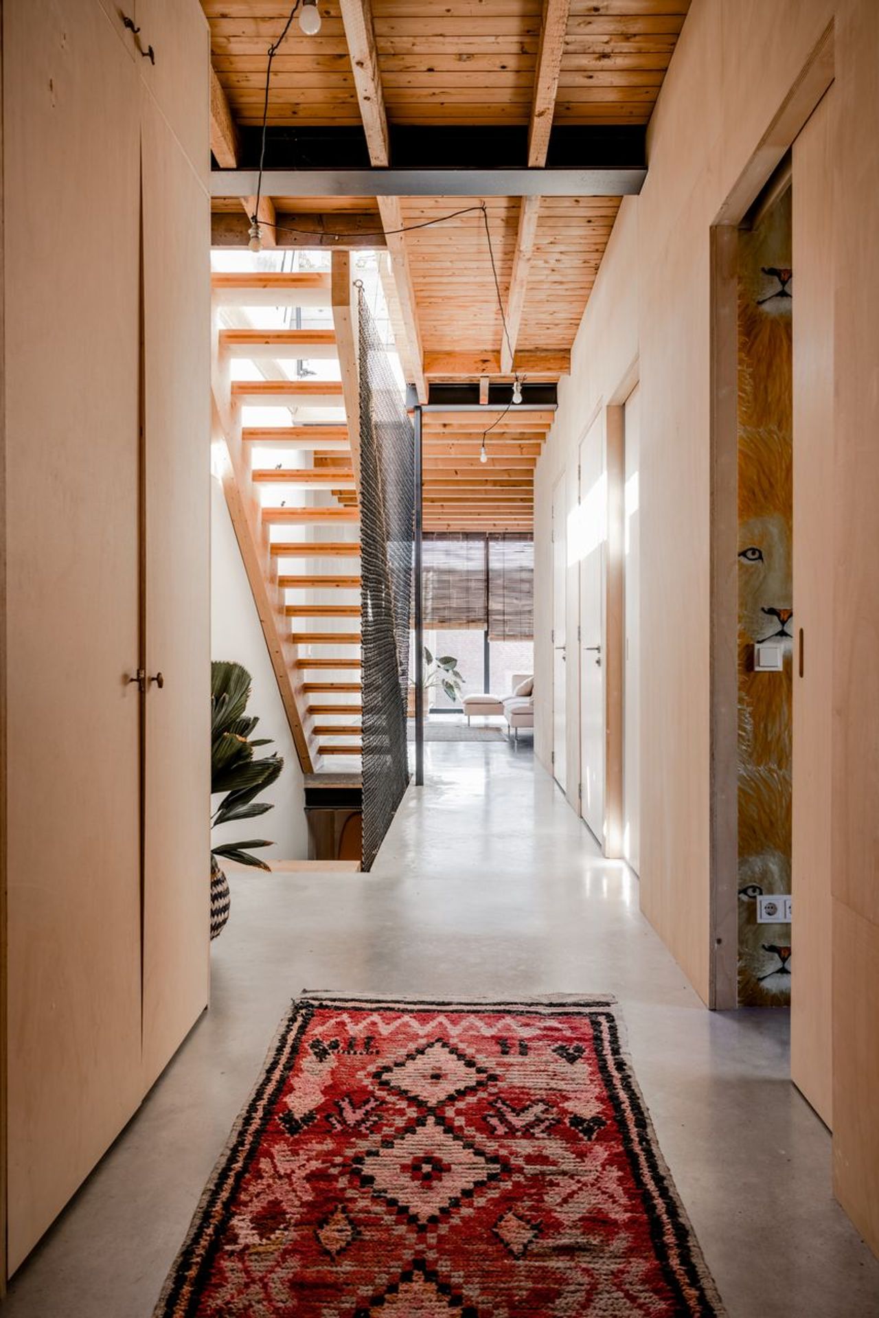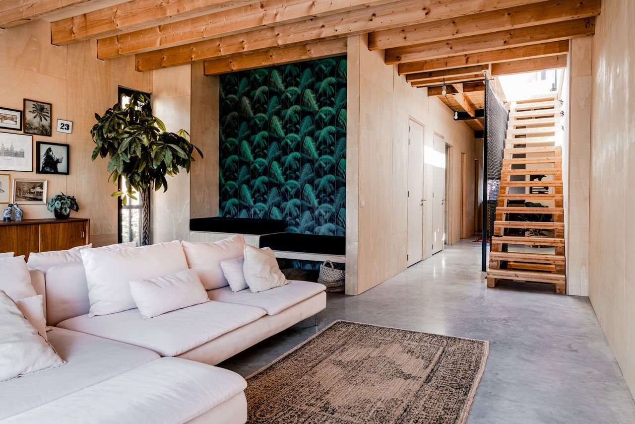 Voor het interieur is er gewerkt met het principe ruwbouw = afbouw. In Nederland vrij ongewoon. Dit vraagt om een andere mindset tijdens ontwerpen en bouwen. De nieuwe betonnen vloeren hebben geen beschermende coating, maar zijn slechts gevlinderd en gepolijst. Het oude verlaagde plafond werd gesloopt, waarbij de houten planken op een zwart stalen balkenconstructie wederom goed zichtbaar zijn. De nieuwe plafonds bestaan uit een open houten balkenconstructie waarop de populieren multiplex platen zorgen voor constructieve samenhang, maar ook gelijk de afbouw zijn. Hetzelfde geldt voor de binnenwanden waarbij populieren multiplex platen van de houtskeletwanden in het zicht zijn gebleven. De trappen bestaan uit CLT (kruislings verlijmd hout) en ook deze zijn onafgewerkt gebleven.