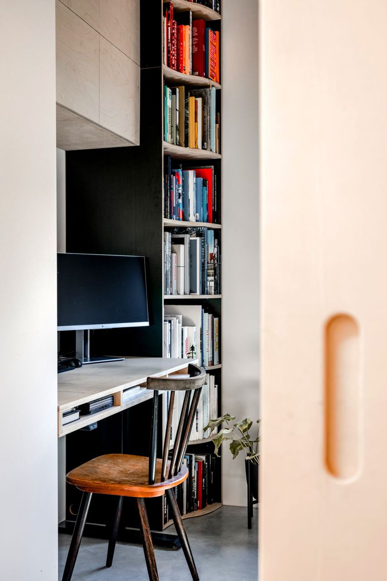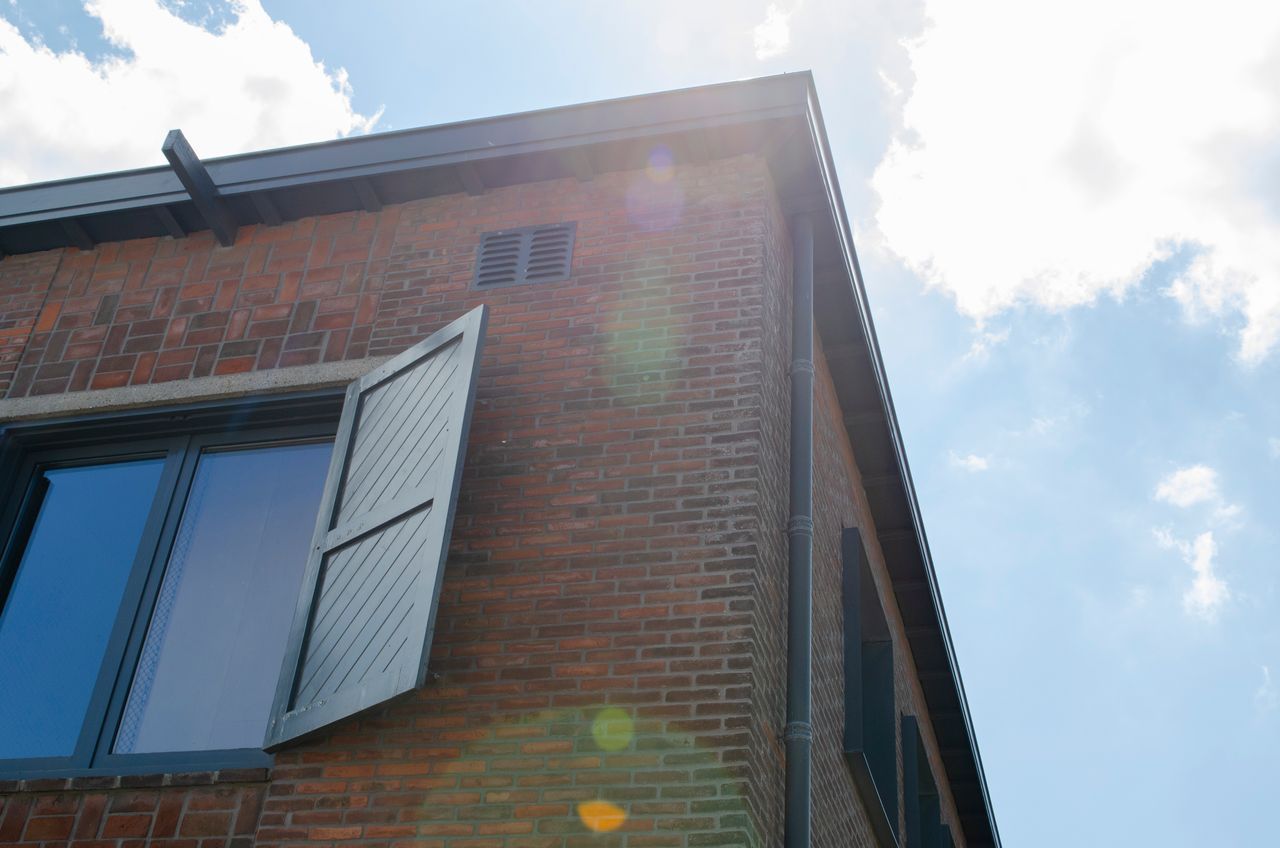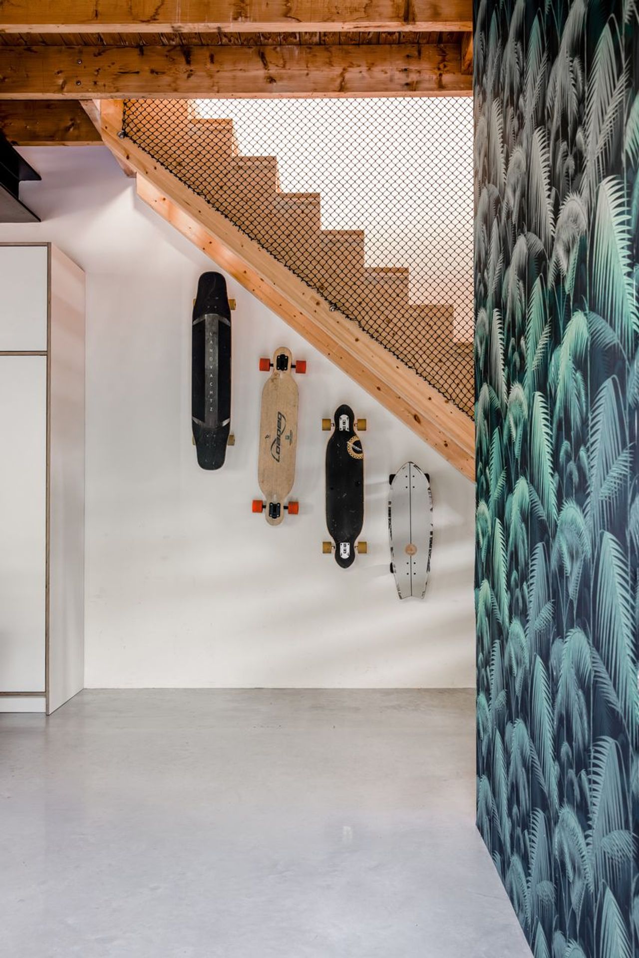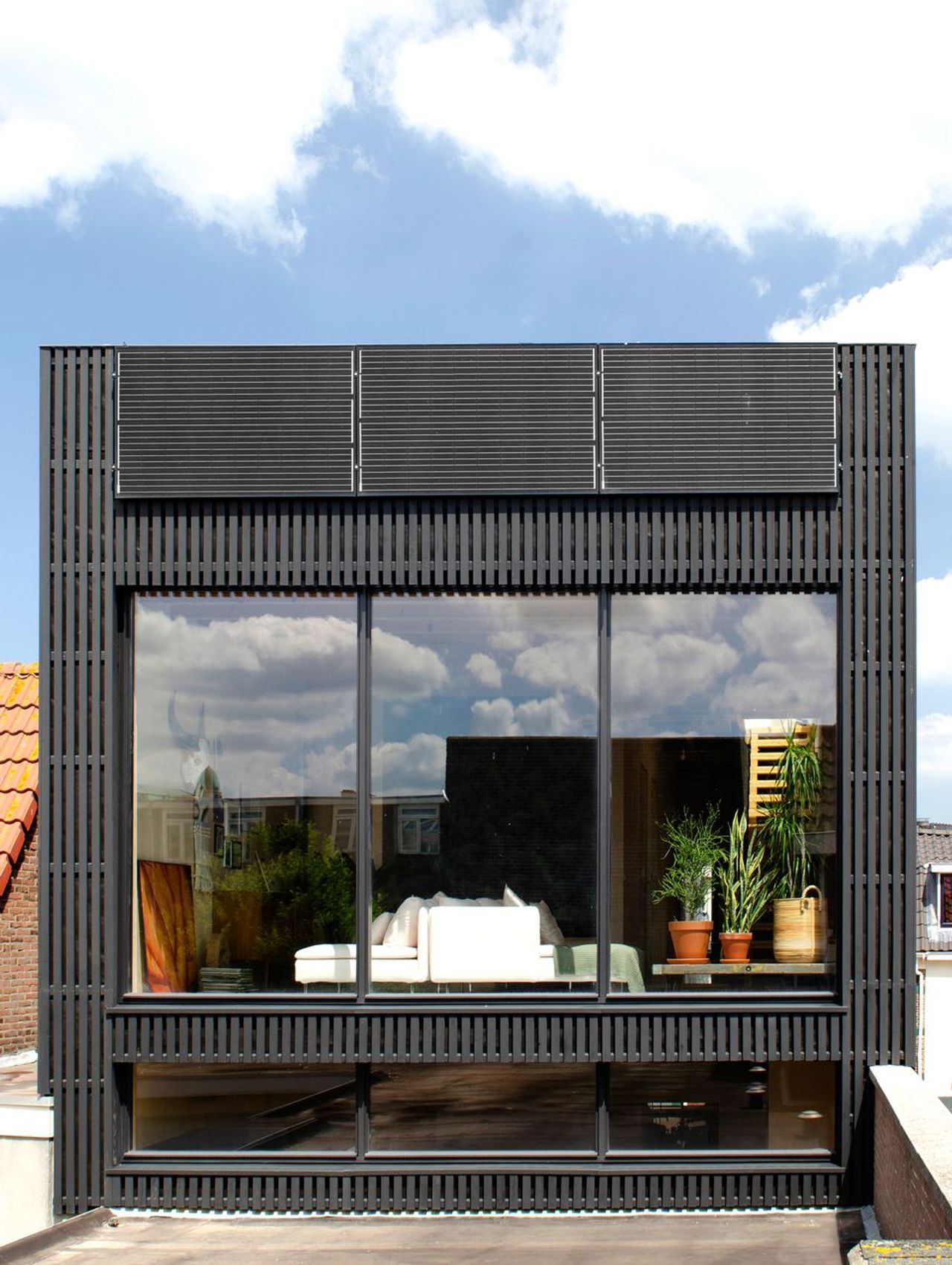 Het exterieur is zoveel mogelijk gerenoveerd om de ziel van het pand te behouden. Daar waar ingrepen gedaan zijn, is er bewust gekozen om dit expliciet te tonen. In de zijgevel zijn er nieuwe kozijnen aangebracht op de verdieping. Deze kozijnen zijn omkaderd door uitkragend zinken zetwerk en als het ware in de gevel ‘geschoten’. Een andere goed zichtbare ingreep is het nieuwe volume aan de achterzijde. De gevel van deze blokachtige massa is bekleed met zwarte houten latten, die naadloos overloopt in de balustrade van het dakterras. Een mooi contrast met het bestaande oude metselwerk van de bollenschuur.