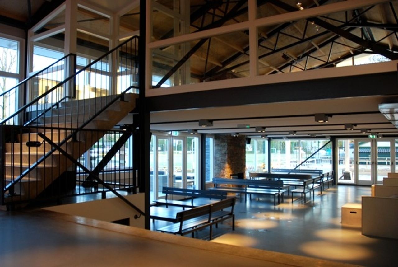 Belangrijk in dit ontwerp is dat het clubhuis van drie verdiepingen, waar honderden mensen tegelijk kunnen zijn, ook gezellig moet zijn met 30 man. Door het ontwerp met de split levels is het gebouw geschikt voor gezelschappen van verschillende groottes.