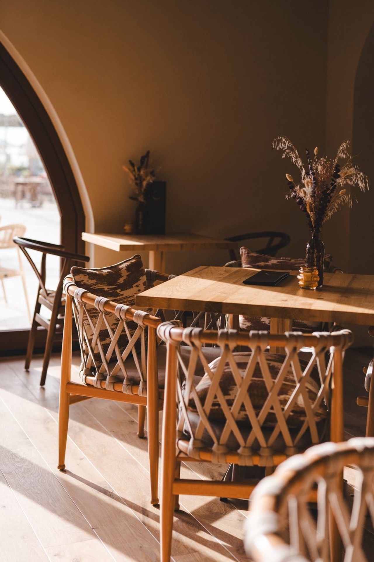 Het huidige terras met strandhuisjes maakt plaats voor een ruime horecalocatie met zwembad. Naast een verfrissende duik biedt deze uitbreiding ook extra ruimte voor feesten en bijeenkomsten, wat de locatie flexibeler maakt voor evenementen. De architectuur is vol karakter en is uitgevoerd in een bohemian chic-stijl met mediterrane invloeden. De combinatie van ronde vormen, natuurlijke materialen, hoge palmbomen en een lounge met vuurhaarden zorgt voor een ontspannen en gastvrije sfeer. Bij de nieuwe entree worden de gasten verwelkomd door een prachtig uitzicht, zichtbaar door de nieuwe glazen gangpartij. Aan de rechterzijde bevindt zich het huidige restaurant, terwijl aan de linkerzijde toegang wordt geboden tot het nieuwe gedeelte. In dit nieuwe deel leidt de route naar het grote daklicht in het midden van de ruimte. Onder dit daklicht is een stijlvolle open bar te vinden, die organisch overloopt in het buitenterras.