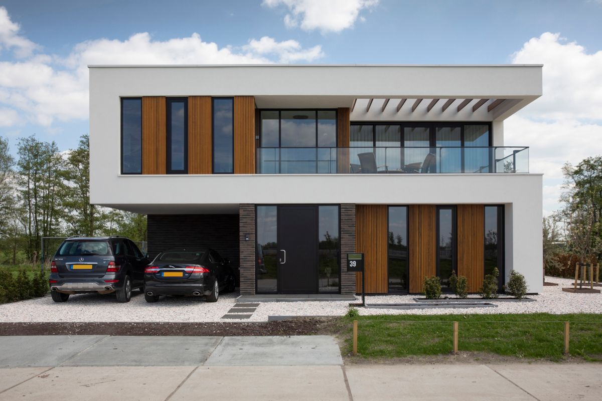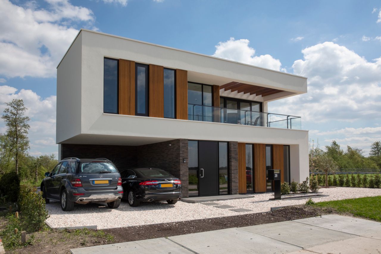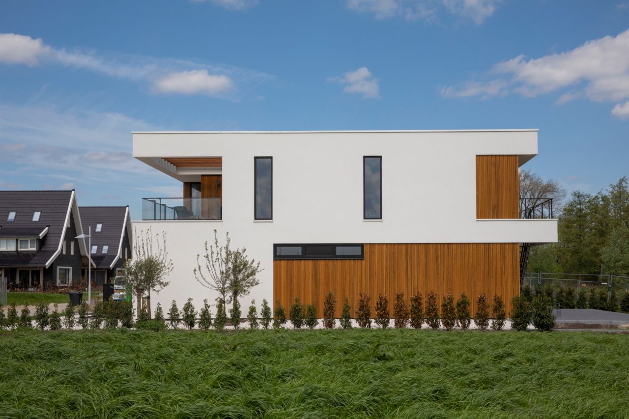 Op een van de vrije kavels in het waterrijke natuurlandschap van de Zuidhoek in Nieuwkoop hebben we een ontwerp gemaakt voor een stoer en modern woonhuis. Deze witte villa is ontworpen als een scherp gedefinieerd blok met uitsneden voor een zuidgericht balkon op de verdieping en de carport op de begane grond. In het gevelvlak wordt het spel van deze uitsneden verstrekt door het witte stucwerk af te wisselen met stroken geprofileerde hardhouten geplatoniseerde Fraké delen en stootvoegloos bruin metselwerk.