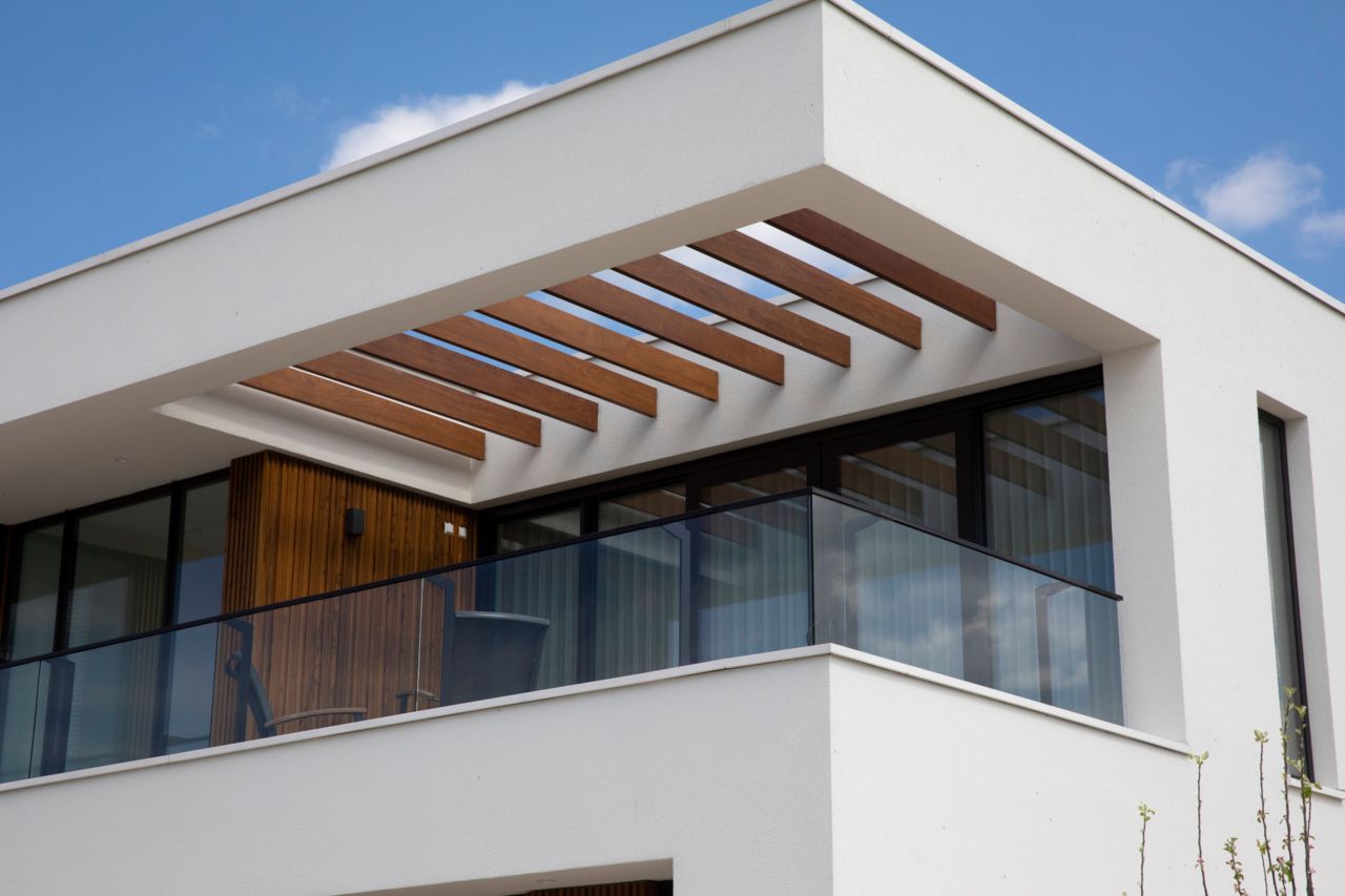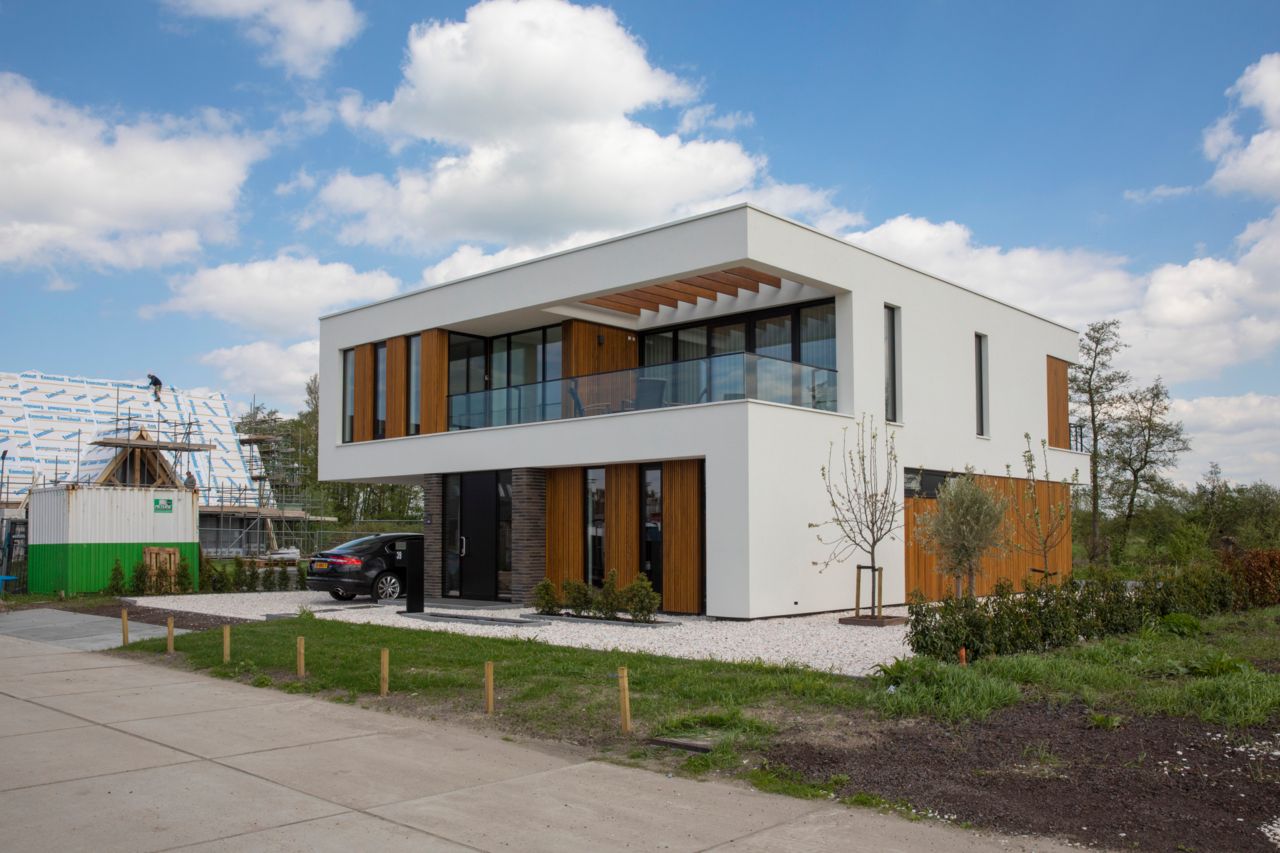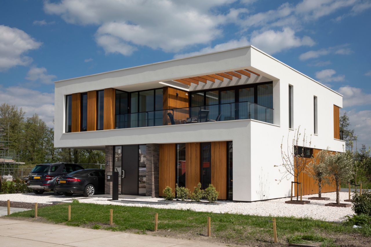 Op een van de vrije kavels in het waterrijke natuurlandschap van de Zuidhoek in Nieuwkoop hebben we een ontwerp gemaakt voor een stoer en modern woonhuis. Deze witte villa is ontworpen als een scherp gedefinieerd blok met uitsneden voor een zuidgericht balkon op de verdieping en de carport op de begane grond. In het gevelvlak wordt het spel van deze uitsneden verstrekt door het witte stucwerk af te wisselen met stroken geprofileerde hardhouten geplatoniseerde Fraké delen en stootvoegloos bruin metselwerk.