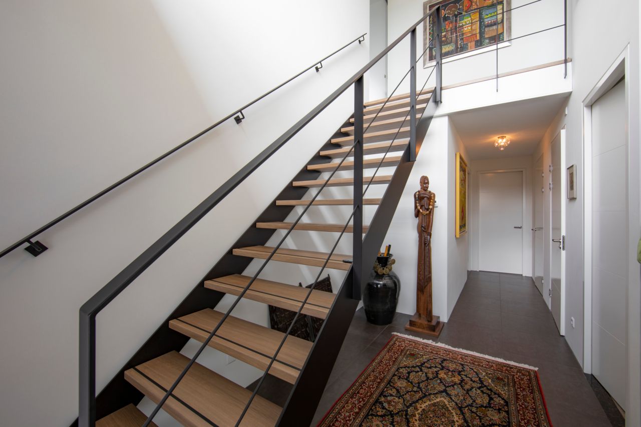 Vanwege het prachtige uitzicht op de Zuideinderplas wilden de opdrachtgevers graag het woonprogramma op de verdieping situeren. Hierdoor is de verdieping meer open en is de begane grond meer gesloten vanwege de slaapvertrekken die zich hier bevinden. De strak vormgegeven stalen trap met houten treden staat in het dubbelhoge gedeelte van de lichte entree hal. Het natuurlijke daglicht stroomt door een raampartij bij het balkon van boven deze hal binnen.