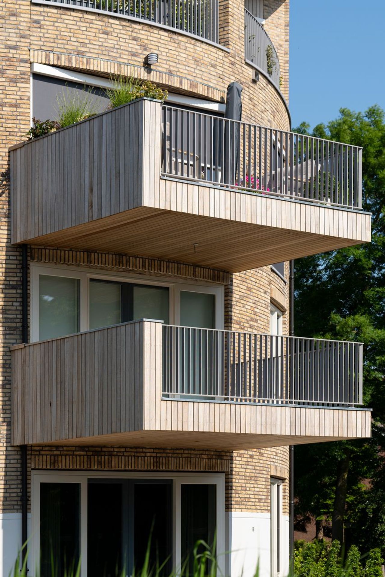 De materialisatie bestaat uit duurzame en tactiele materialen, zoals licht gekleurd metselwerk en natuurlijk houten gevelbekleding. Deze materialen versterken de zachte waardes van het ontwerp. Natuurinclusiviteit heeft een belangrijke rol op deze prominente plek met balkons inclusief geïntegreerde plantenbakken, groene gevels en nestkasten.