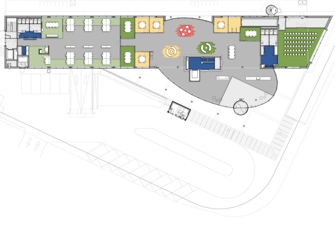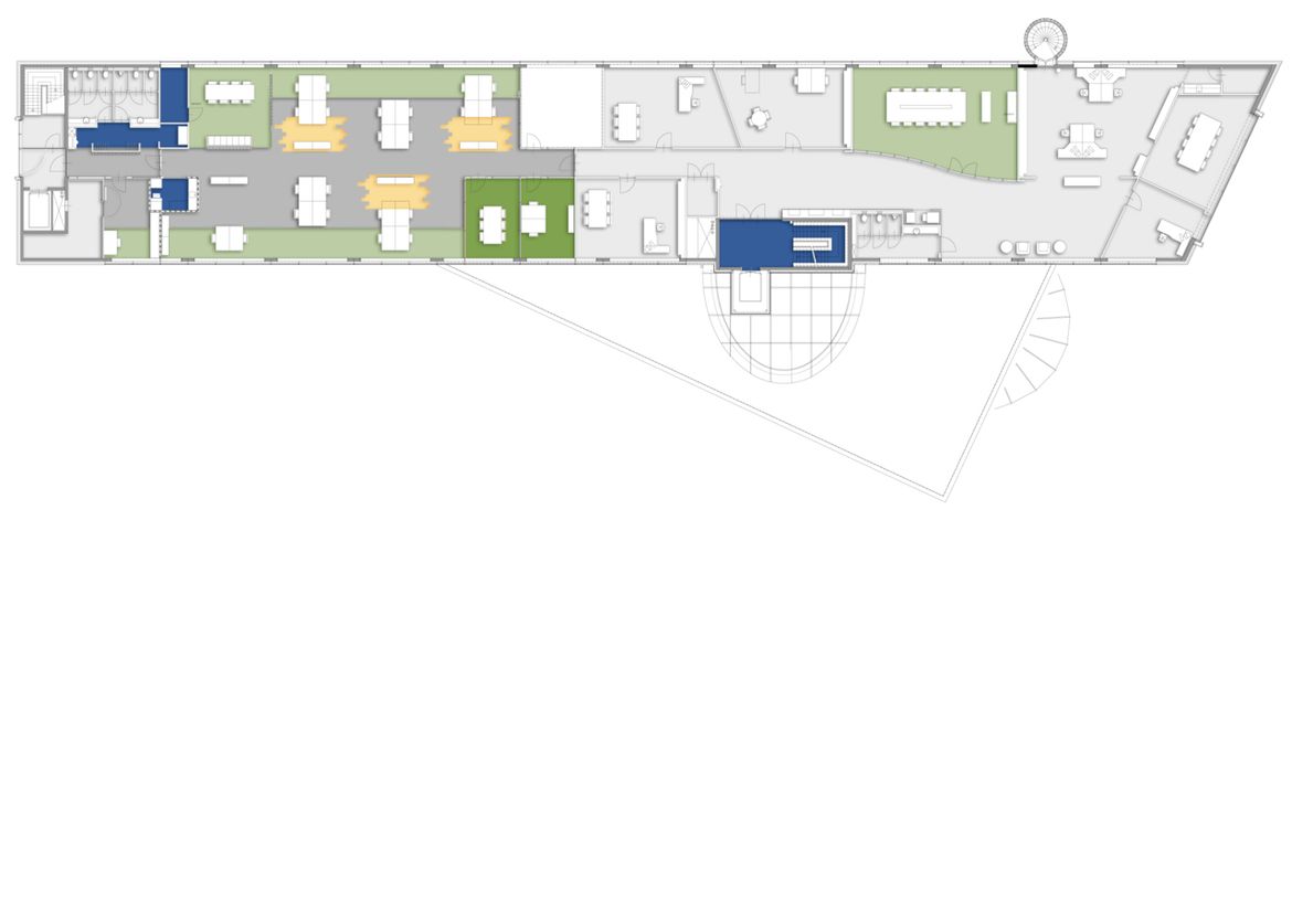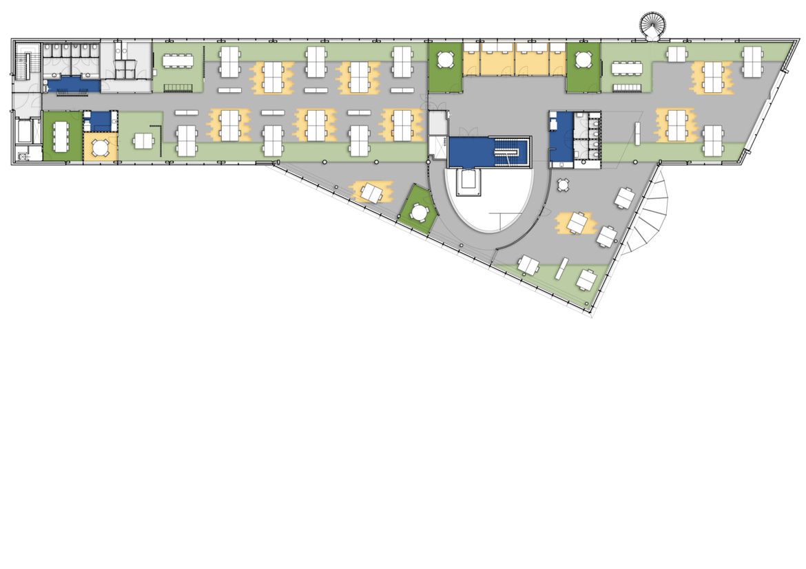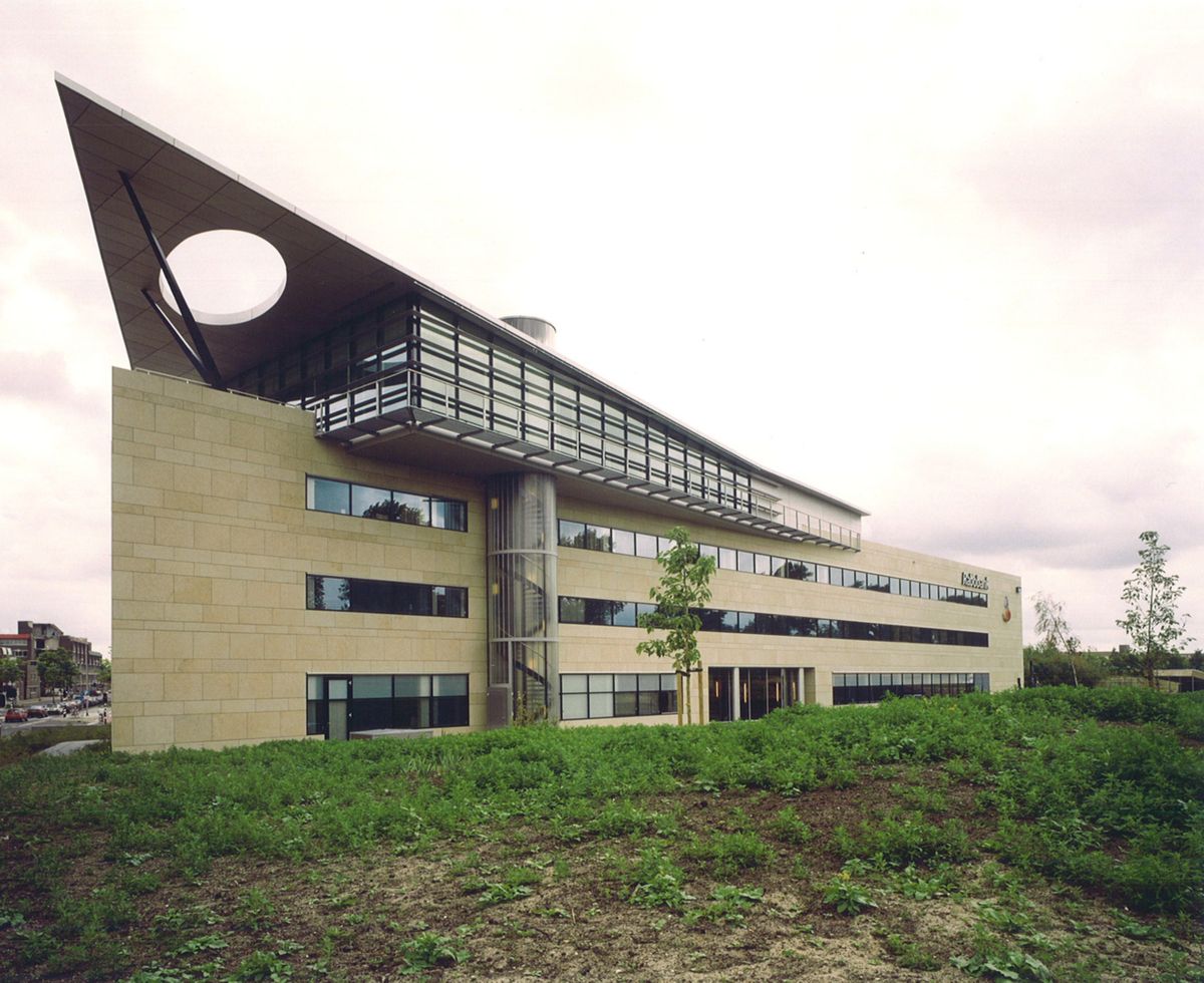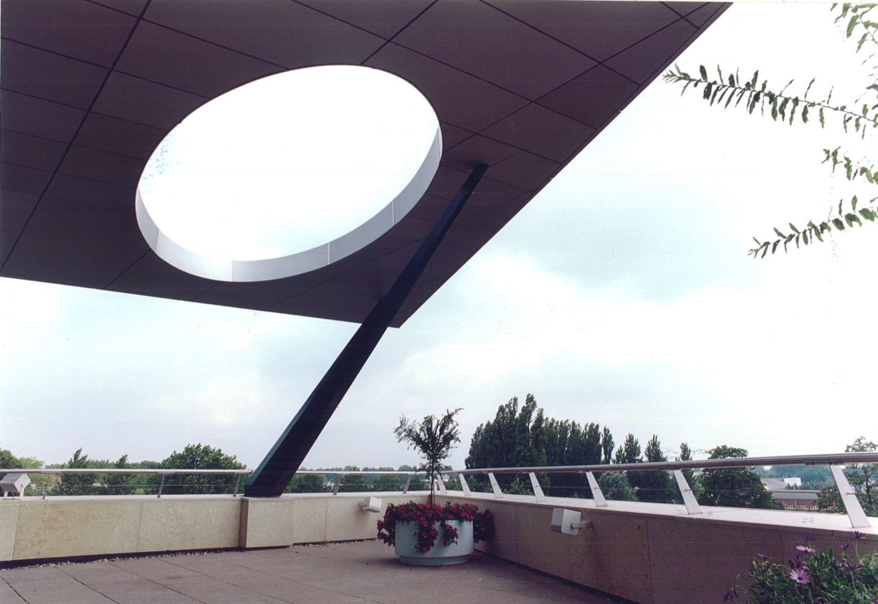 Het terras met de grote luifel met een oculus is te bereiken vanuit het bedrijfsrestaurant in de dakopbouw. Recentelijk hebben we het kantoor vernieuwd van cellenkantoor naar een meer open kantoortuin, geschikt voor het nieuwe werken.