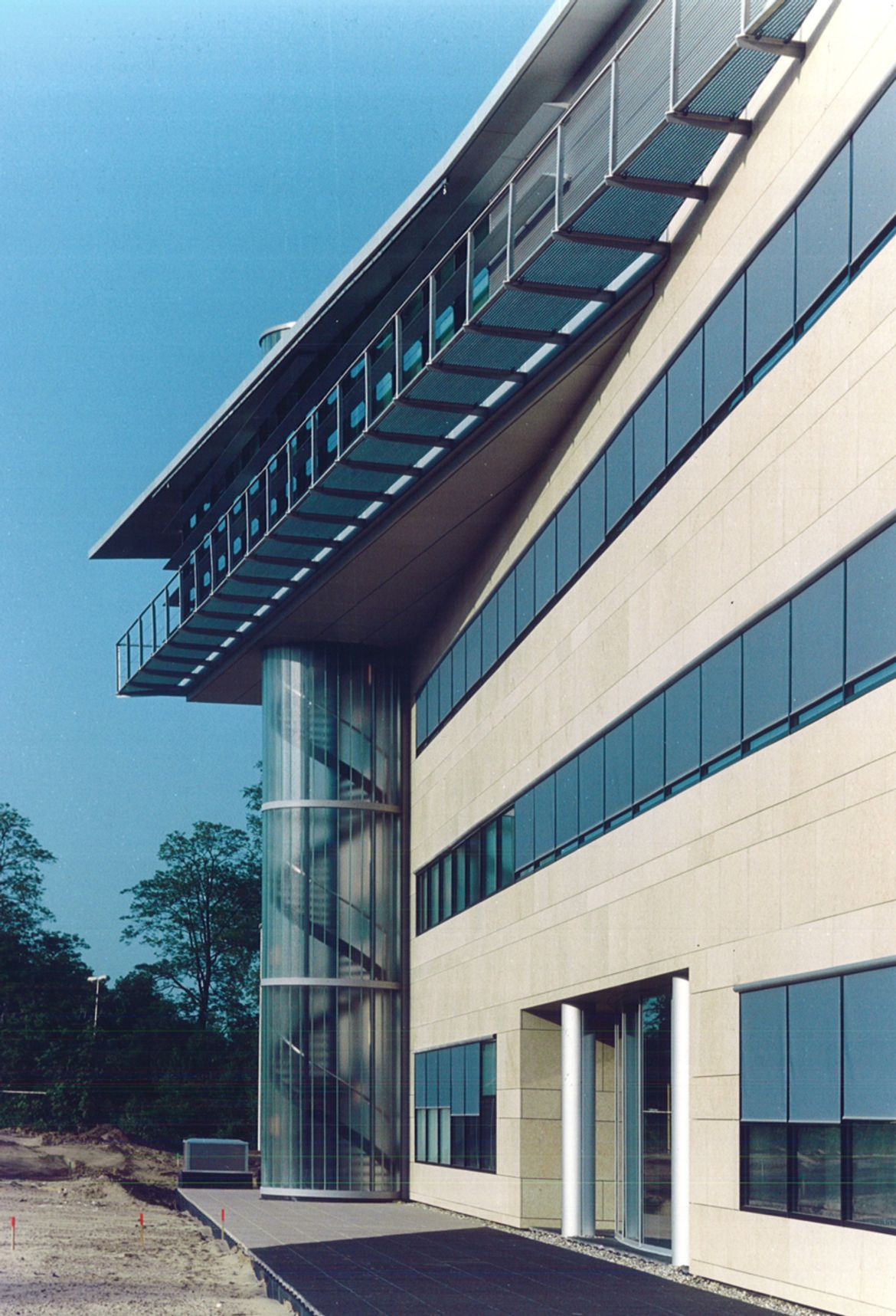 Aan de straatzijde reageert het gebouw met een hoekverdraaiing op het kruispunt. Hierdoor ontstaat ruimte voor de bankhal - het publieke gedeelte van de bank. Aan de spoorzijde verwijzen de horizontale banden van verschillende hoogte naar de snelheid van de treinen. Het industrieel ogende overstek van de dakopbouw draagt hier aan bij. Door de zorgvuldige detaillering op de hoeken geeft de natuurstenen gevelbekleding de indruk dat zij is opgebouwd uit massieve blokken.