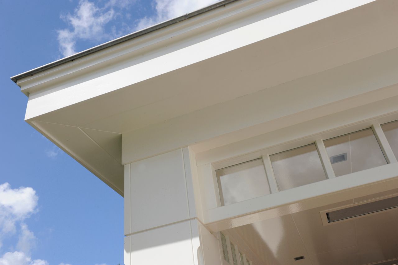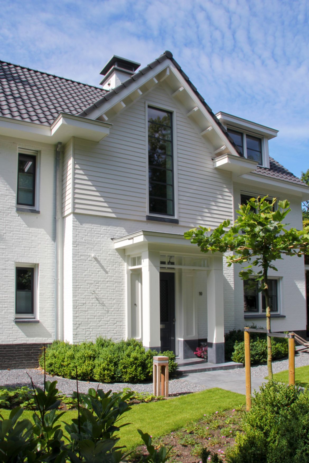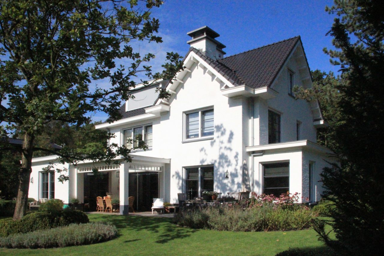 De wit gekeimde villa heeft een donkere plint en kozijnen. Elementen als de waterslagen en de voet van de kolommen zijn in hardsteen gematerialiseerd.
