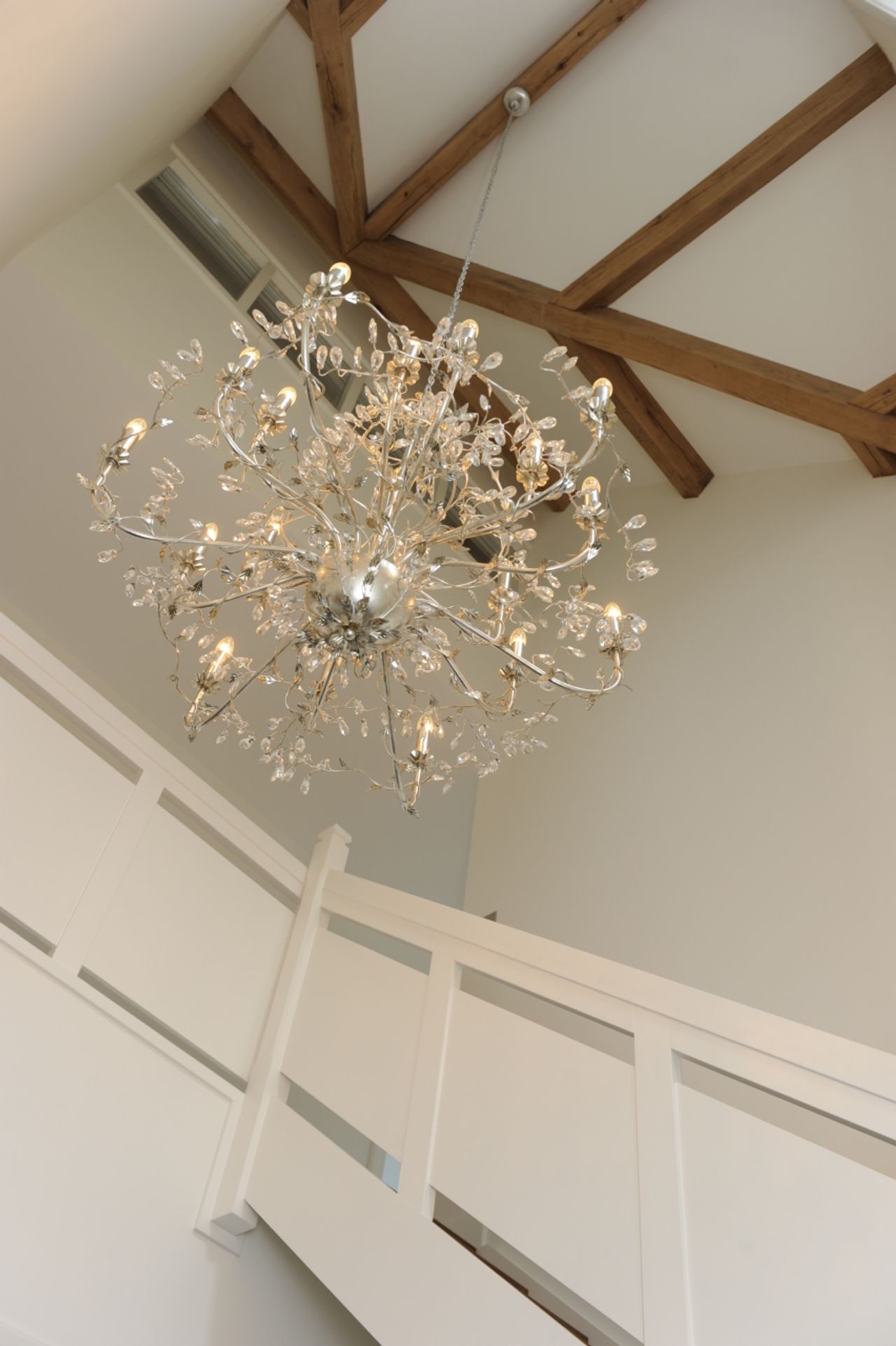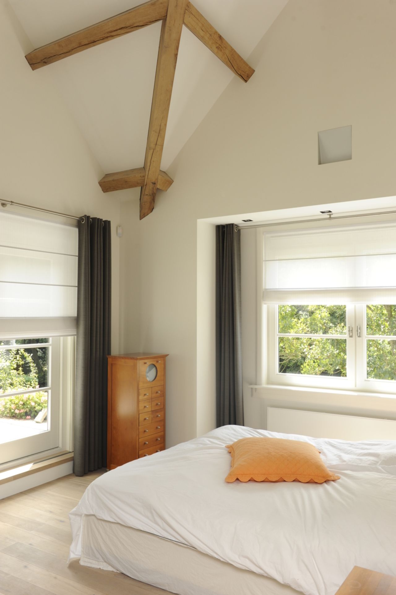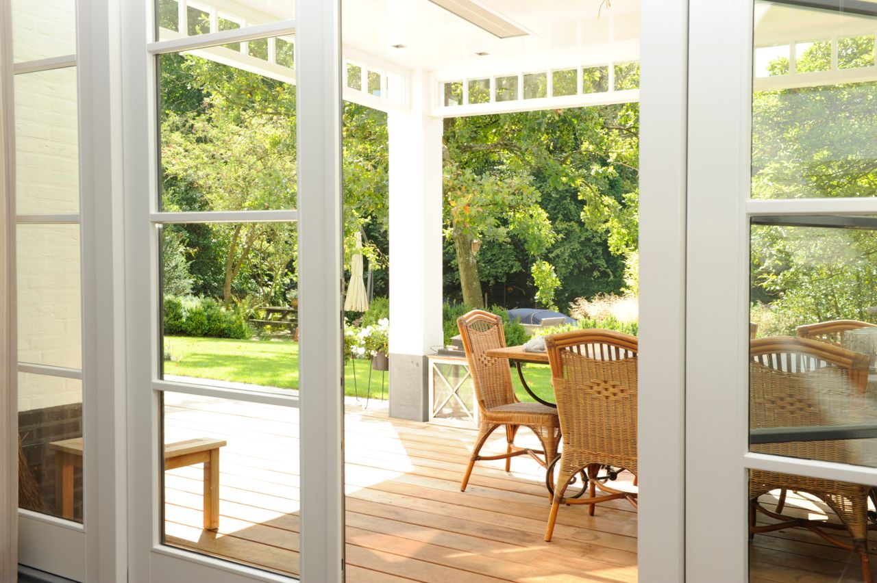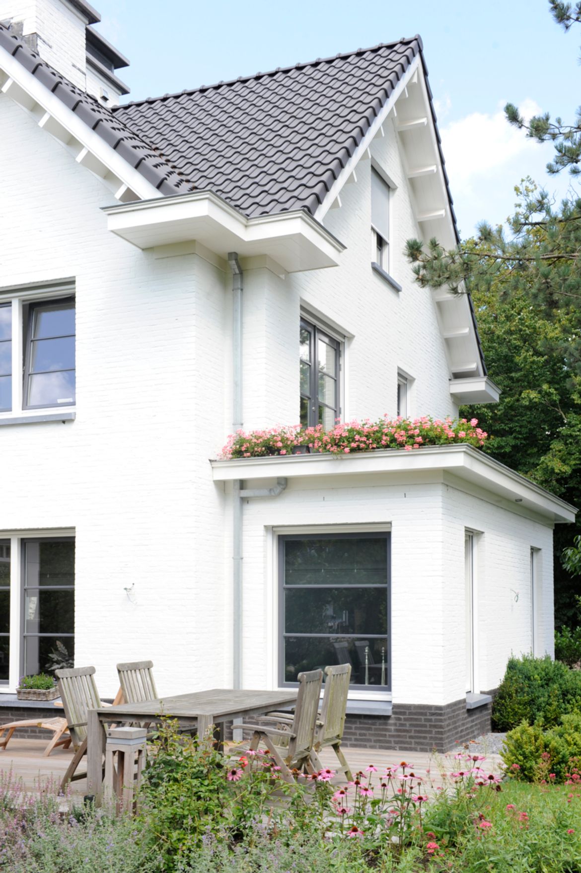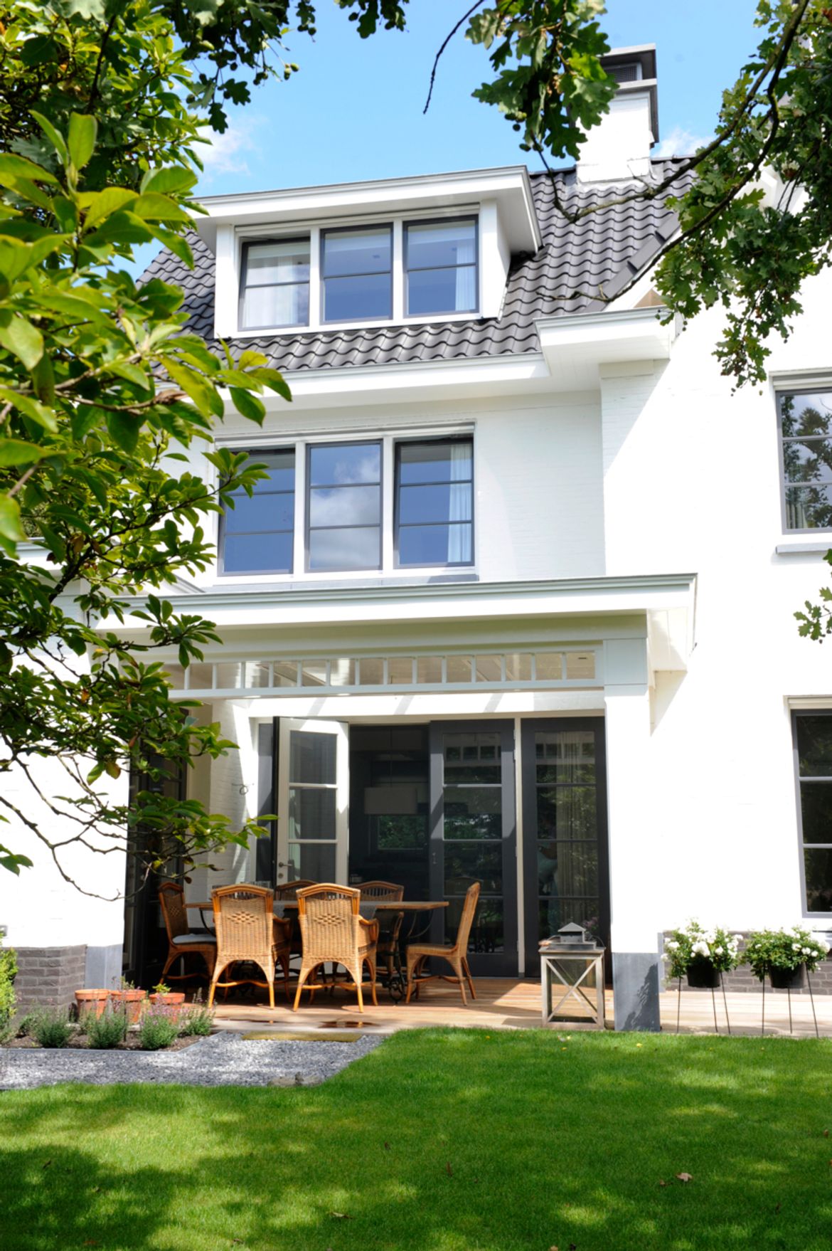 Aan de achterzijde is de dwarskap uit het midden geplaatst, om ruimte te maken voor de veranda, die de eetkamer met de tuin verbind.