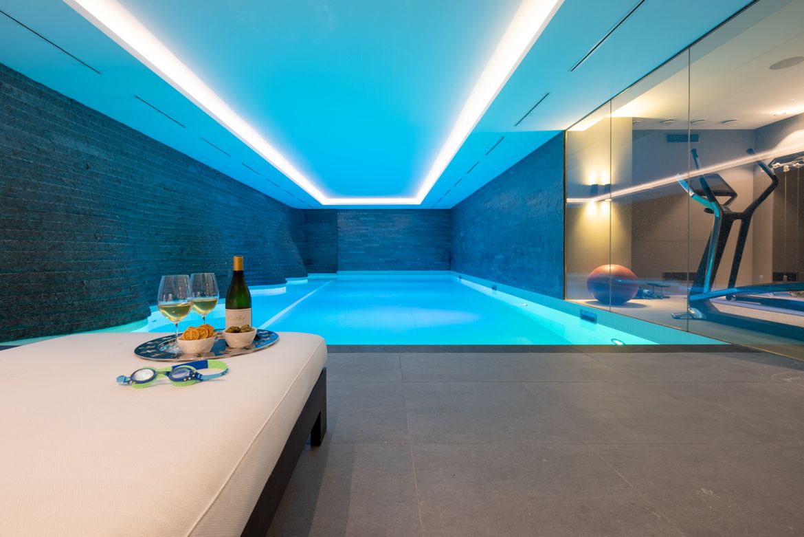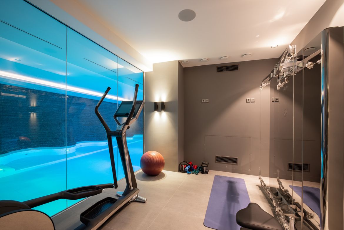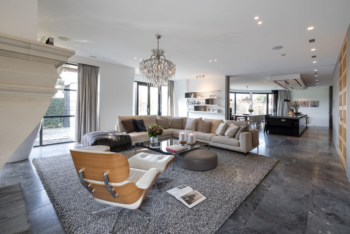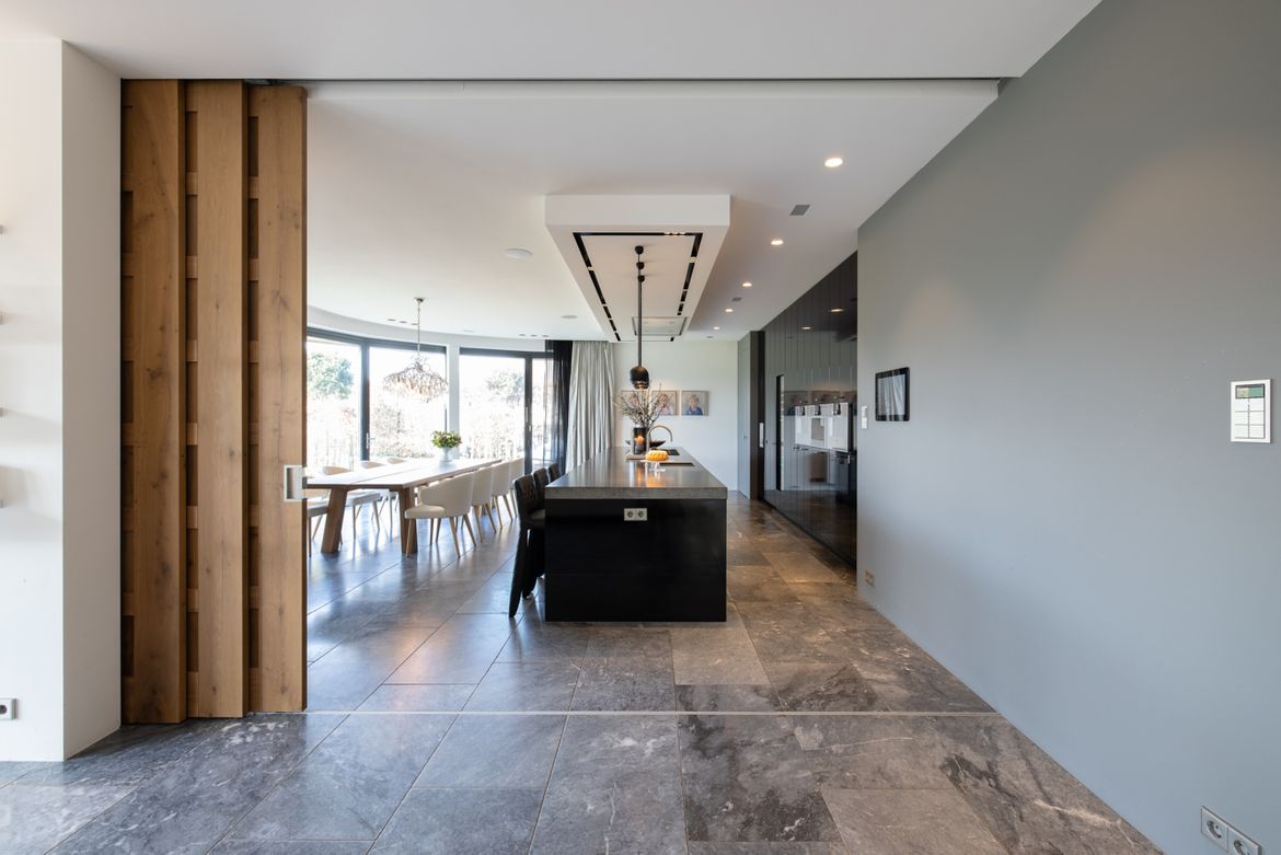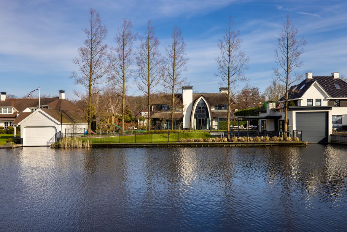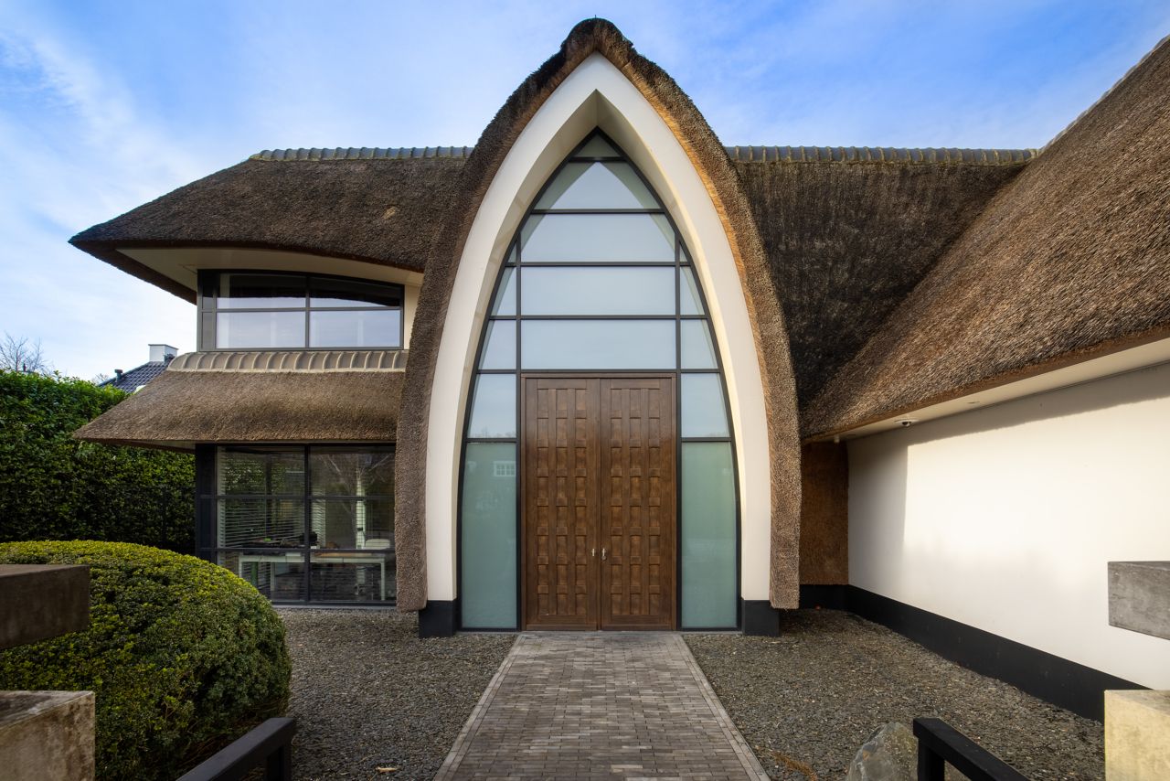 De gevel is opgetrokken uit stucwerk, natuursteen en aluminium puien. De ronde pui van de woonkeuken kan bij mooi weer helemaal worden weggevouwen voor een maximale beleving van de weidse tuin en het water. De villa is groter dan je in eerste instantie zou denken, onder het maaiveld bevind zich nog een volledige verdieping met zwembad, fitness studio, pantry en bioscoopruimte. Het zwembad heeft een gebogen wand van natuursteen dat doorloopt in het water.
