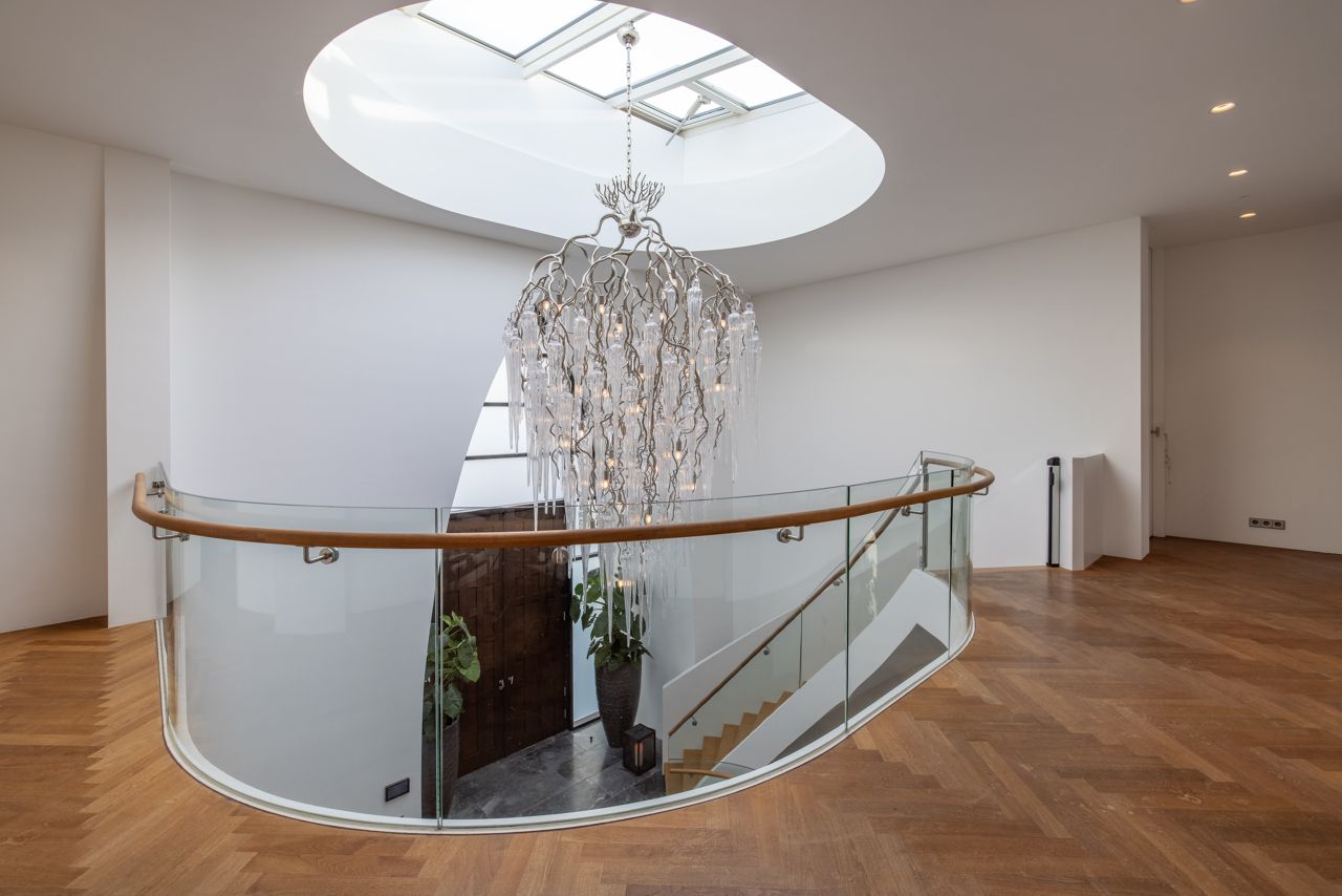 Dubbele dakvlakken met een lijnspel dat de opdrachtgever aan een Riva deed denken, geven de gevel een speels beeld. Een deel van het dak is plat met een enorm dakraam dat de dubbelhoge entreehal van boven verlicht. In deze hal ontwierpen we een spectaculaire trap met gebogen glazen balustrade.