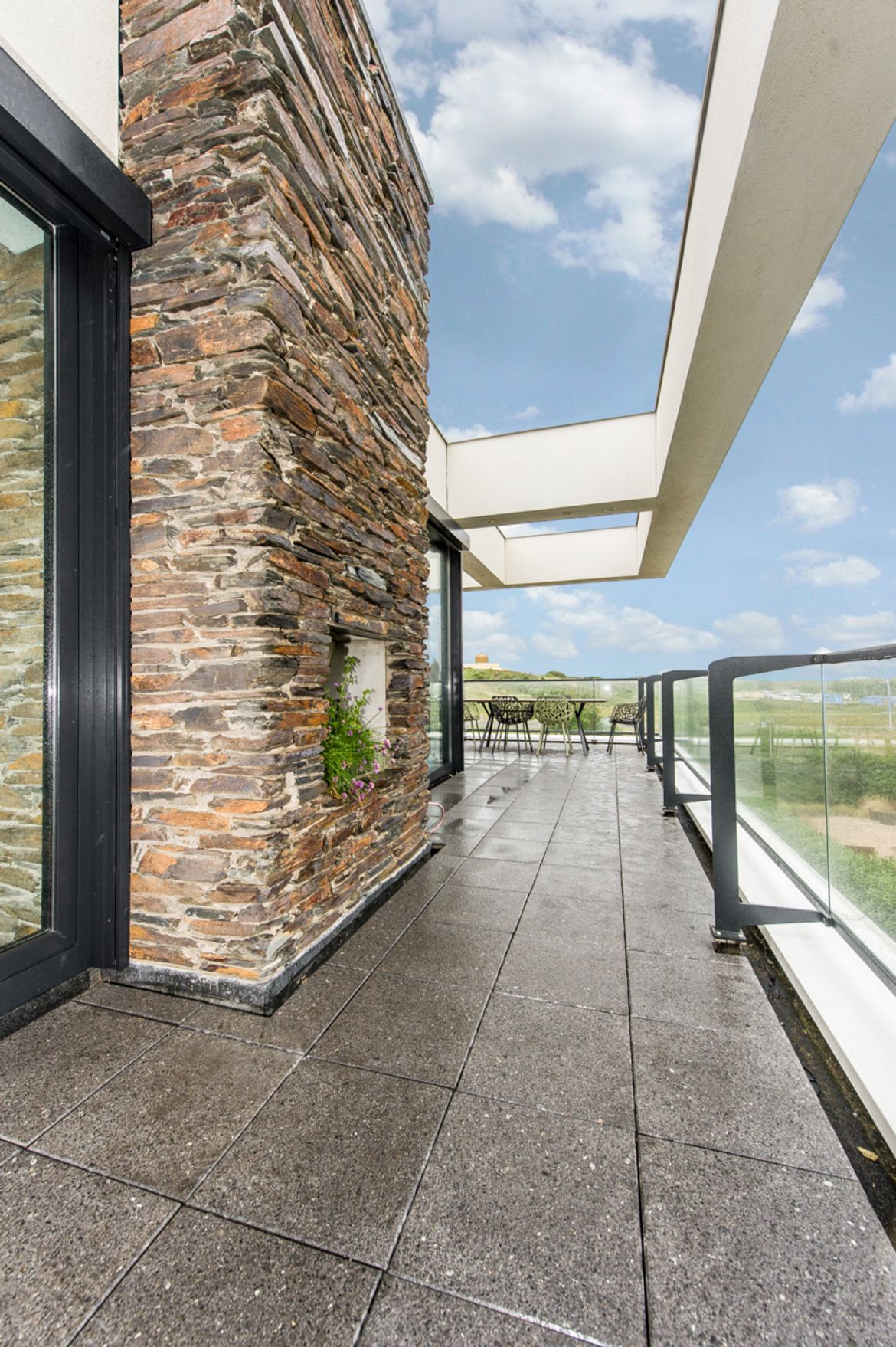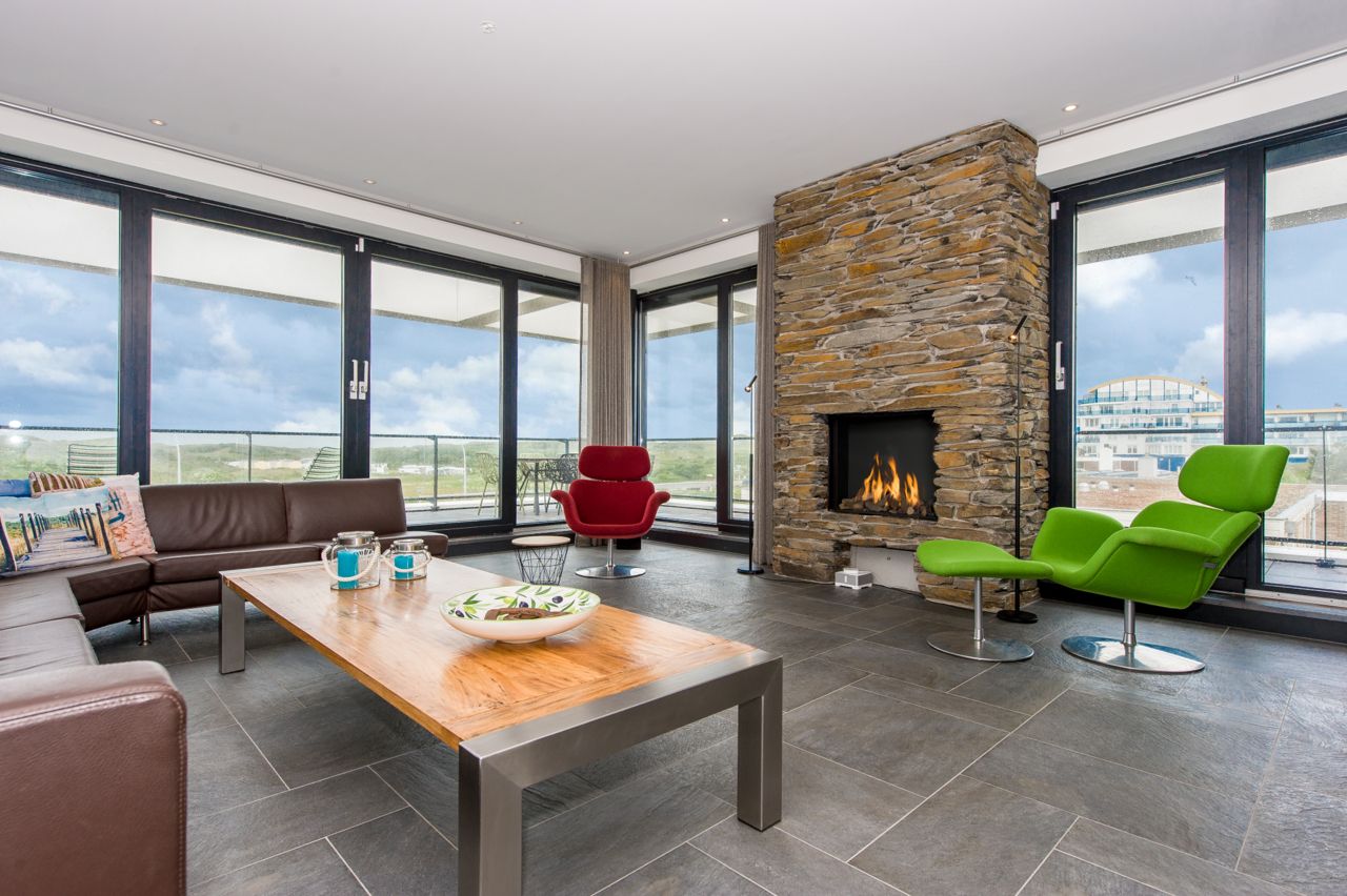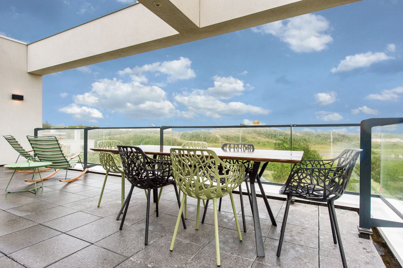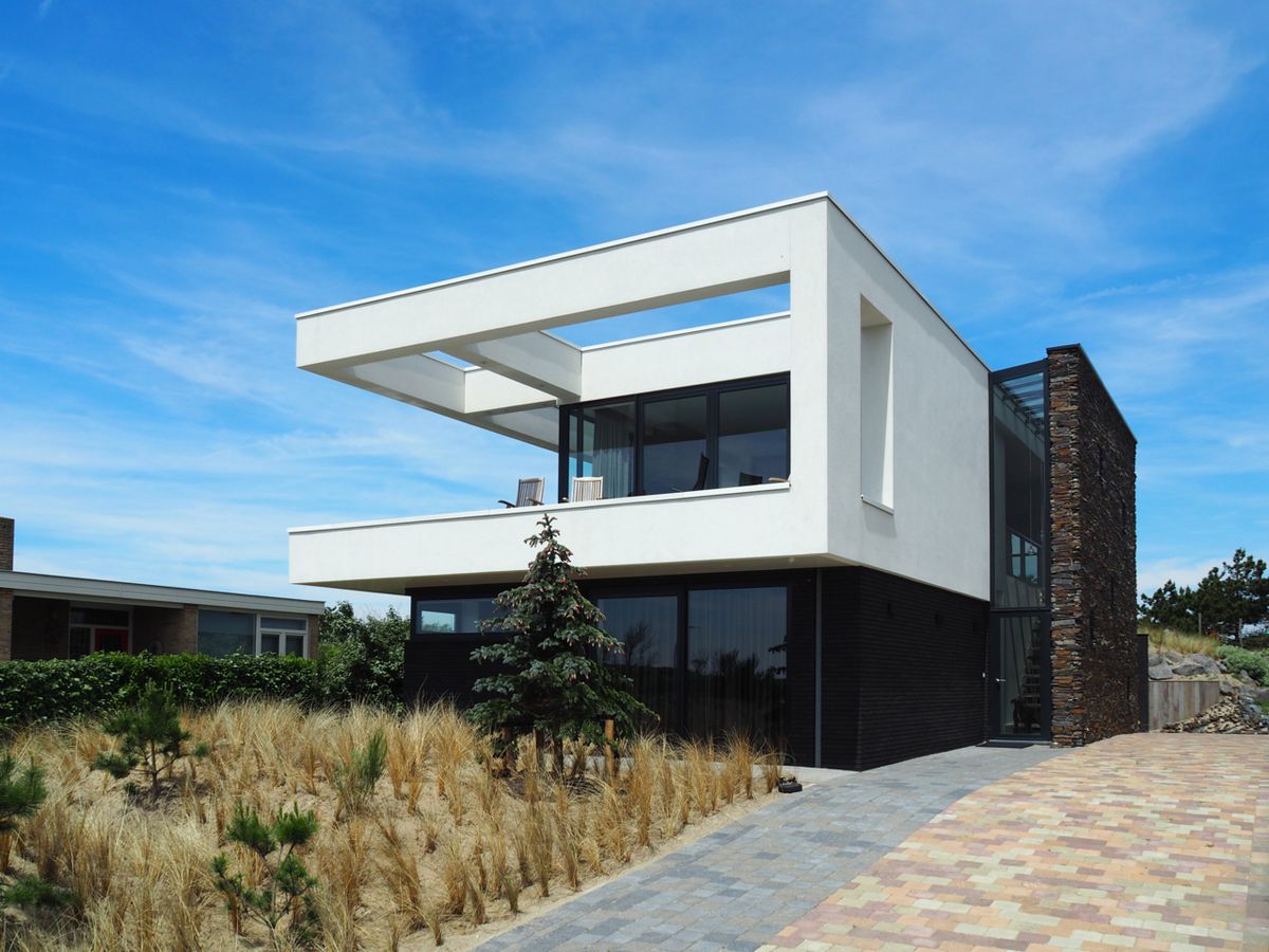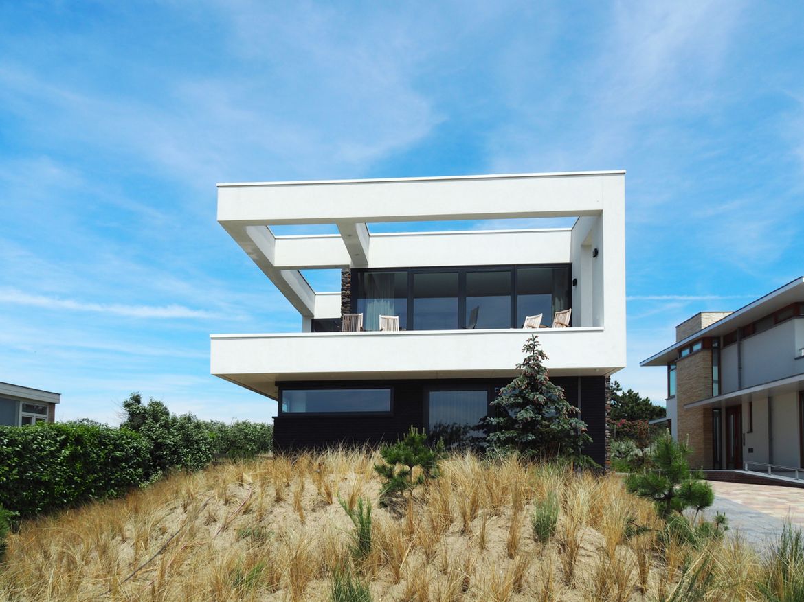 Vanwege de ligging en het prachtige uitzicht over de duinen is de woonverdieping boven en de slaapverdieping op de begane grond gesitueerd. Door een 'hap' uit de bovenverdieping te halen, ontstaat een dakterras op het zuiden. Door terugliggend een extra constructie te creëeren, is er op de hoek aan de voorzijde geen kolom nodig. Op deze manier ontstaat een vrij uitzicht.