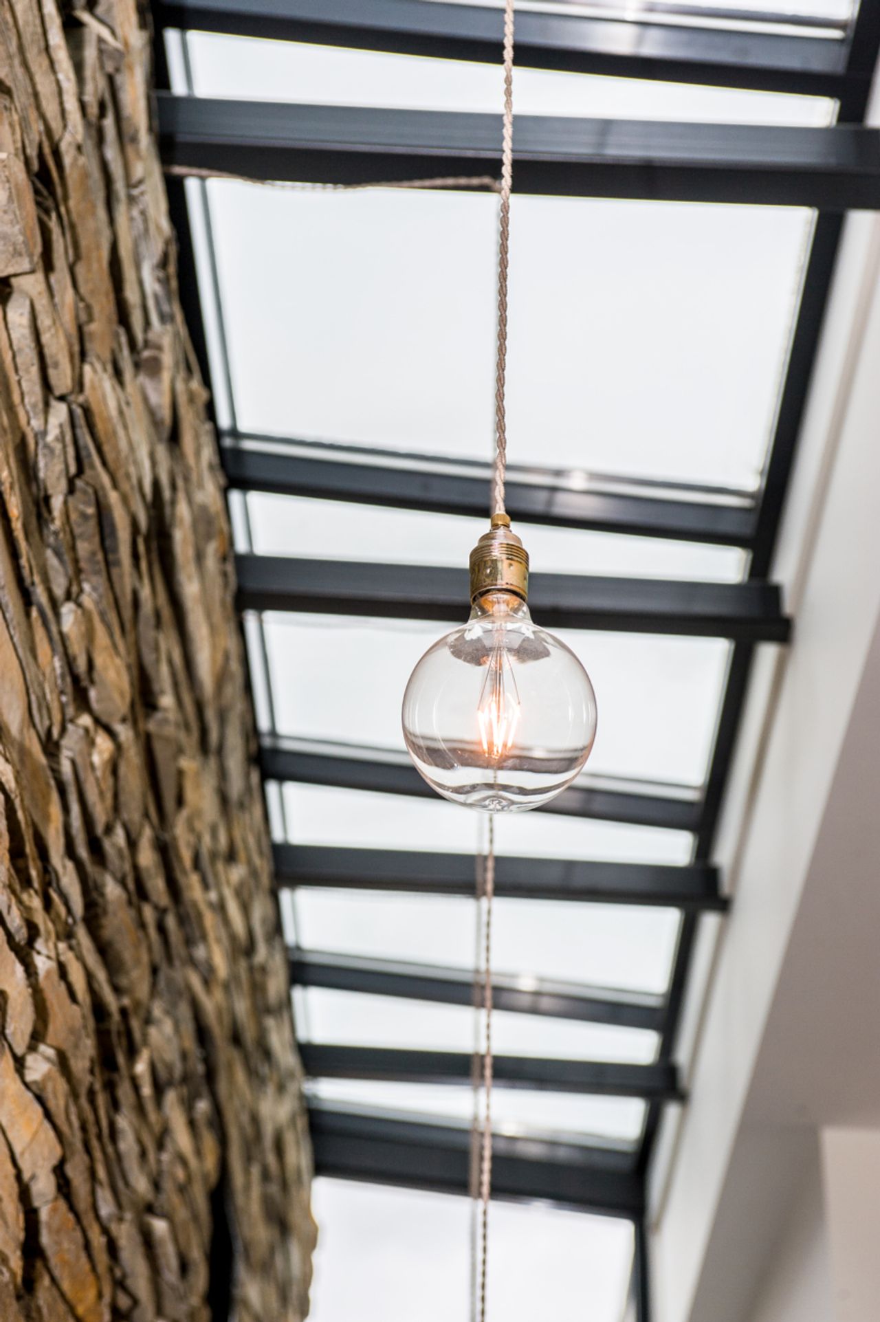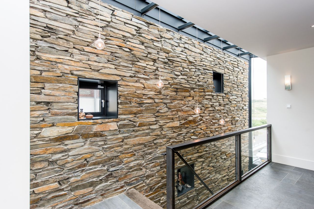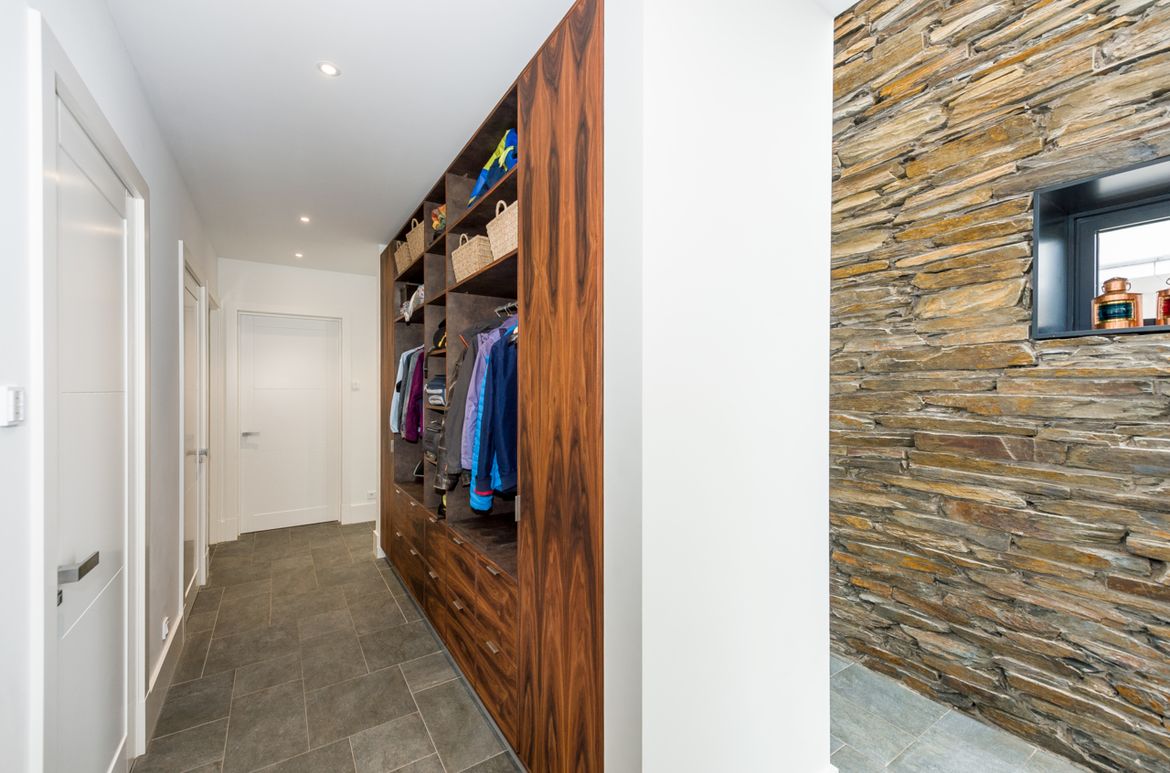 De wand van Moellons, stenen afkomstig uit de Franse Alpen symboliseren de bergen, de houten treden van de trap zijn een vertaling naar de bomen en grijze en witte tinten verwijzen naar de sneeuw. De zwart geschilderde stalen accenten en het vlammende Palissander completeren het palet van deze woning.