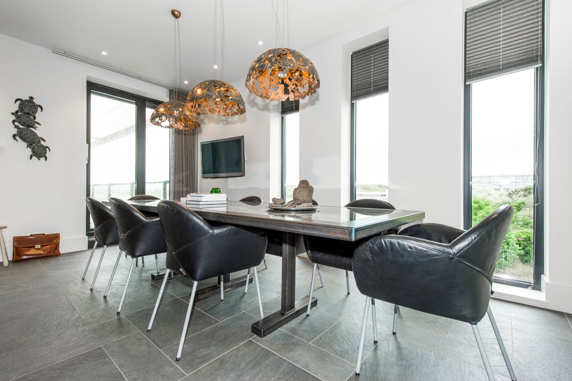 Voor het tuinplan zijn er drie duinen met duinzand gemaakt. Onder één van de drie duinen is de garage verstopt. Ook is nagedacht over eventuele verminderde mobiliteit in de toekomst. Alle woonfuncties kunnen op de bovenverdieping worden geconcentreerd. De toilet bijvoorbeeld is zo groot uitgevoerd dat hier ook een douche in kan worden geplaatst. En natuurlijk is er een plaats gereserveerd voor een eventuele lift.
